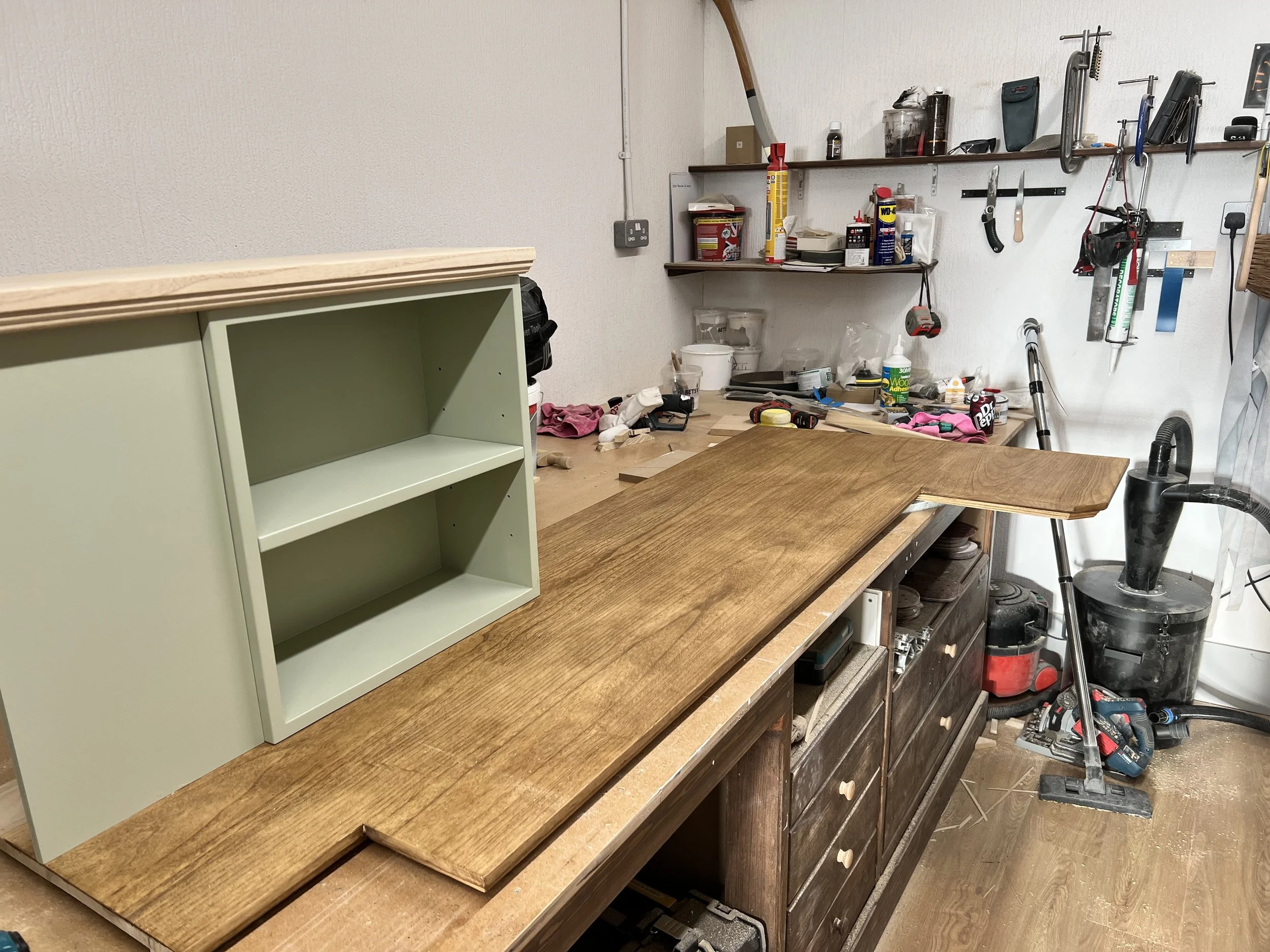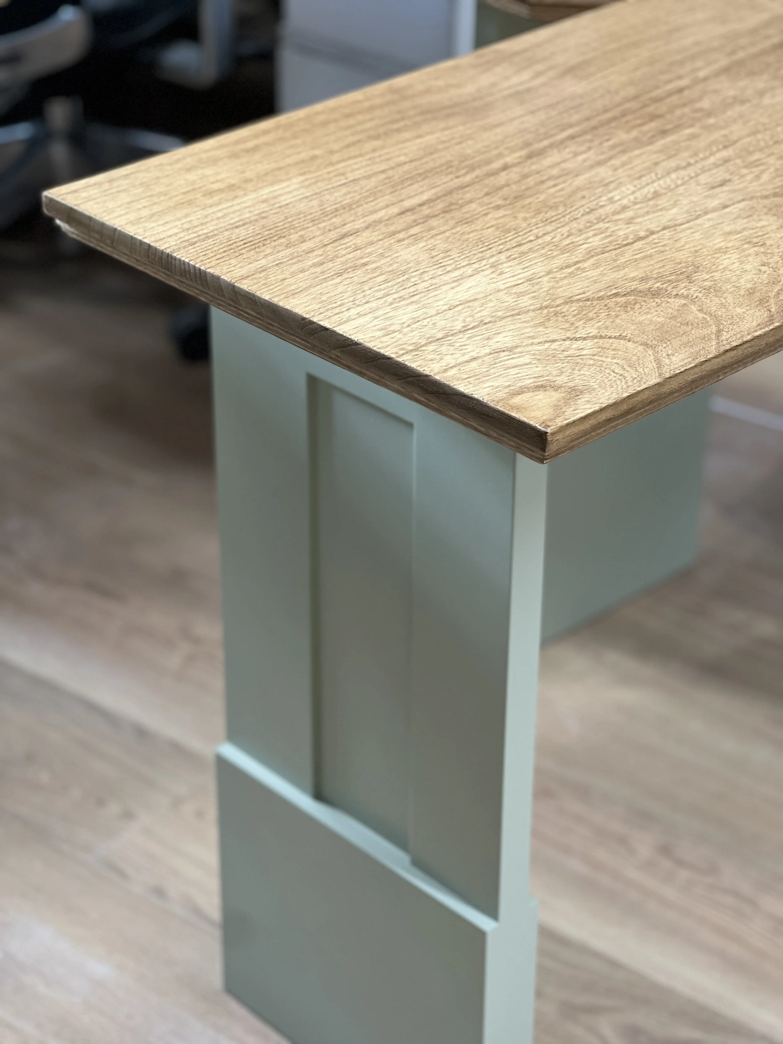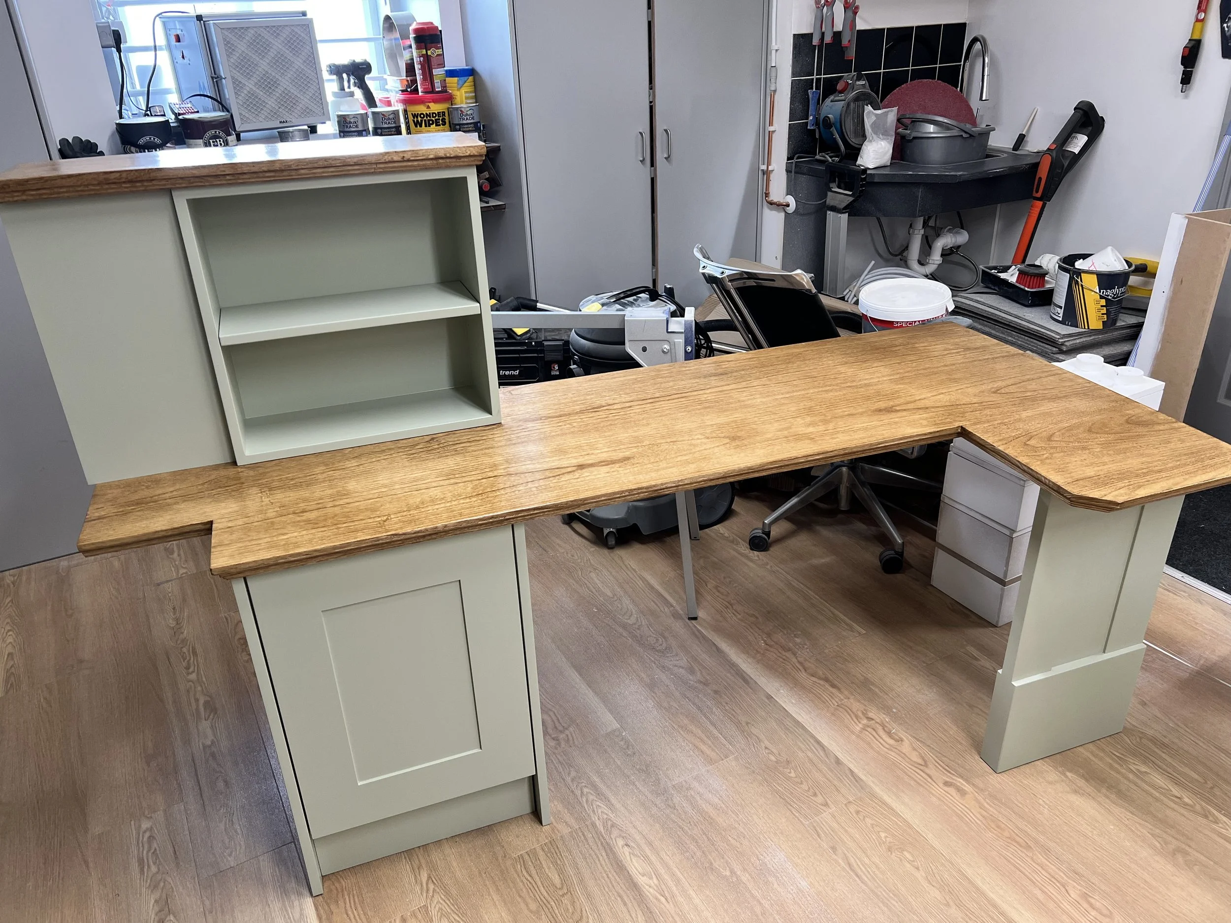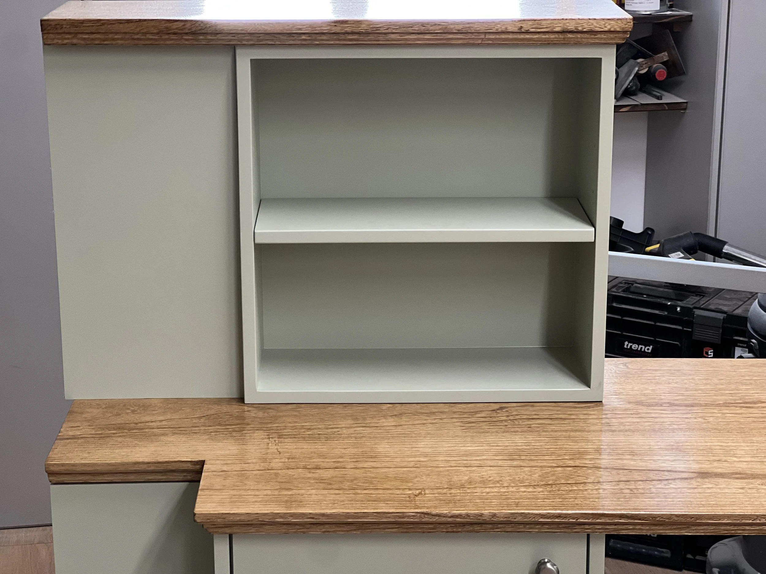 This complete home office was designed and built for a client in Twickenham, featuring a solid oak desktop finished to highlight the natural grain. The cabinetry is painted in Farrow & Ball’s Mizzle, creating a soft contrast with the oak. With integrated storage and hidden compartments for wires and internet services, the design combines elegance with practicality, delivering a clean and organised workspace.