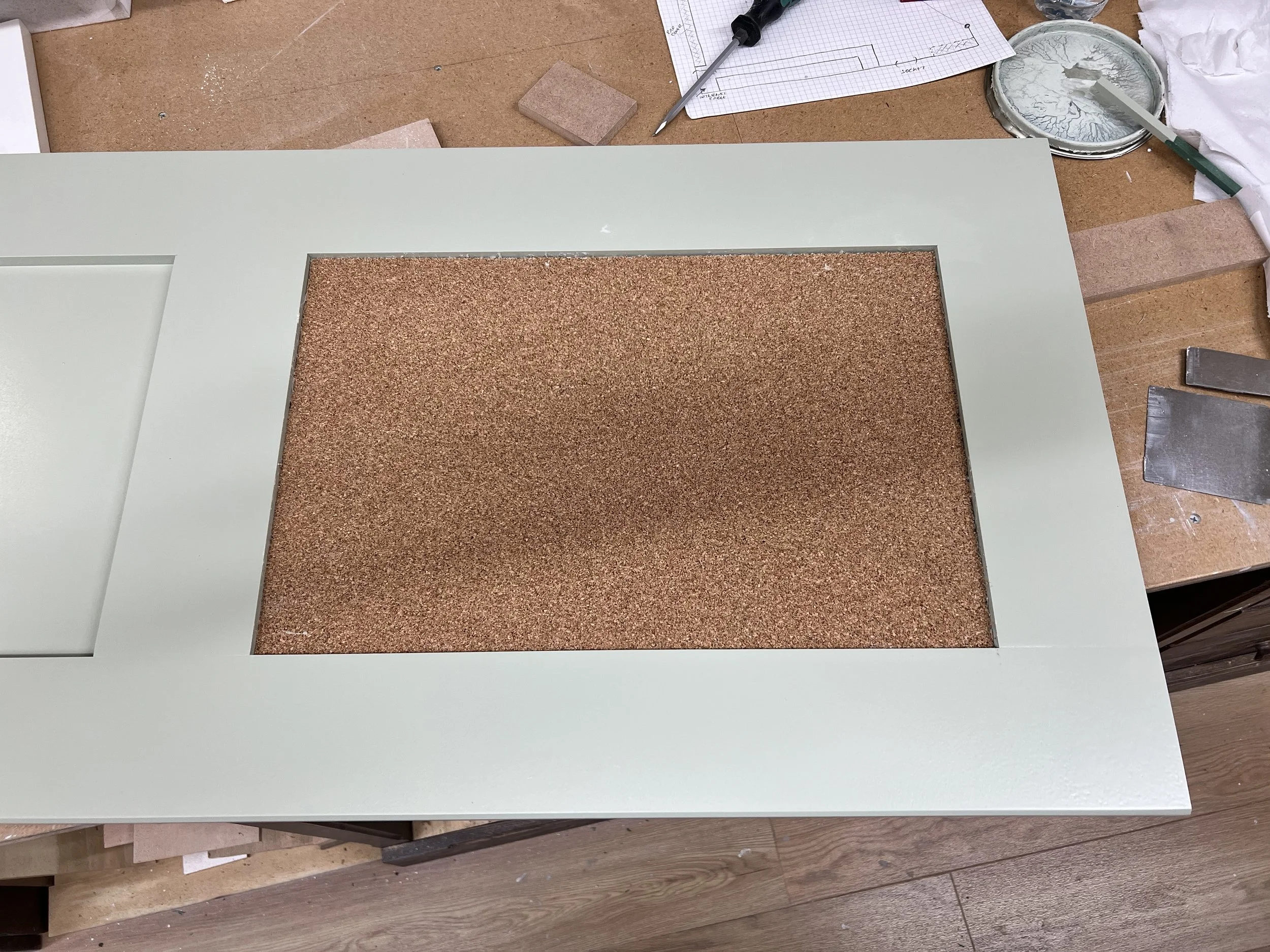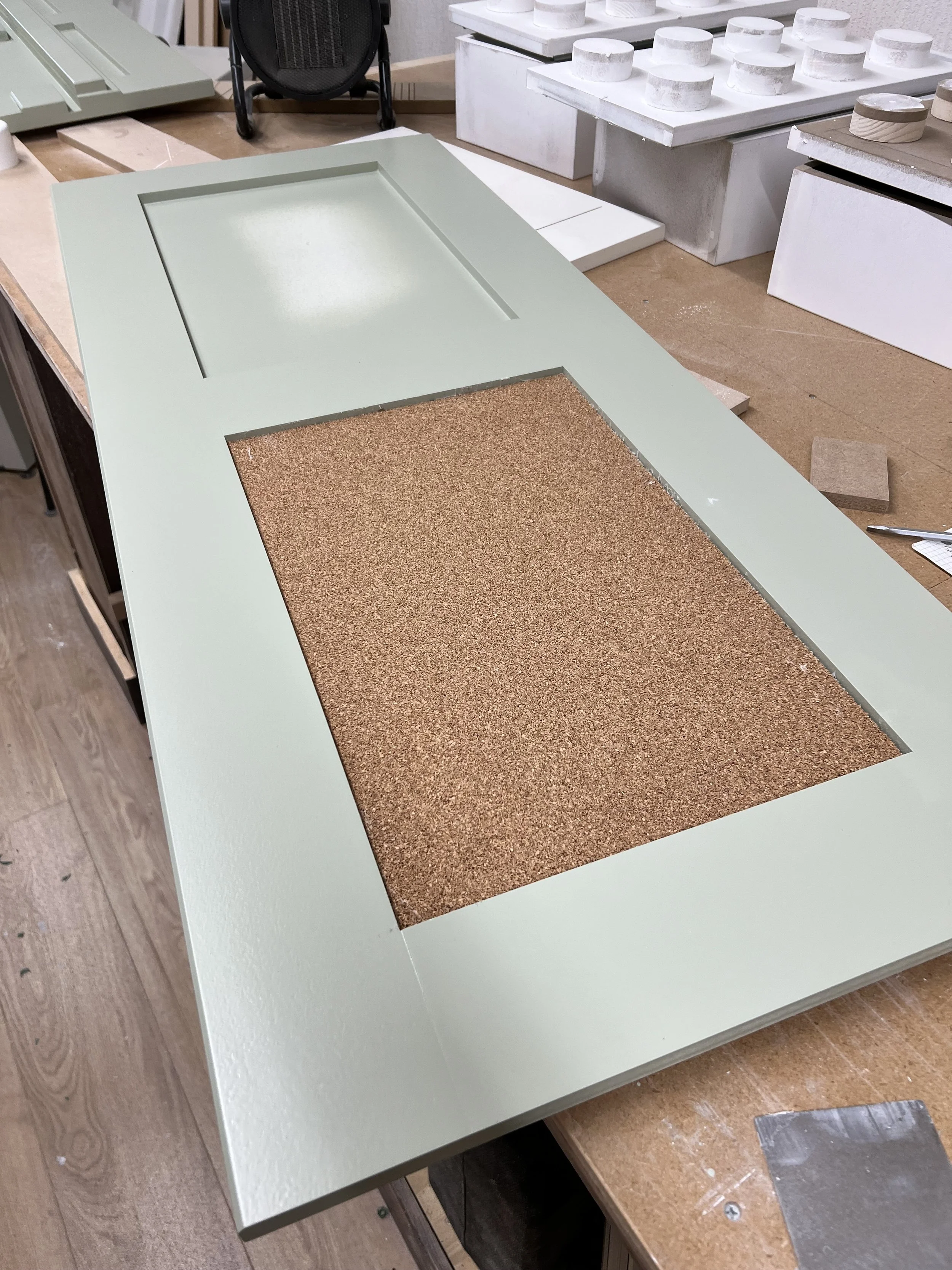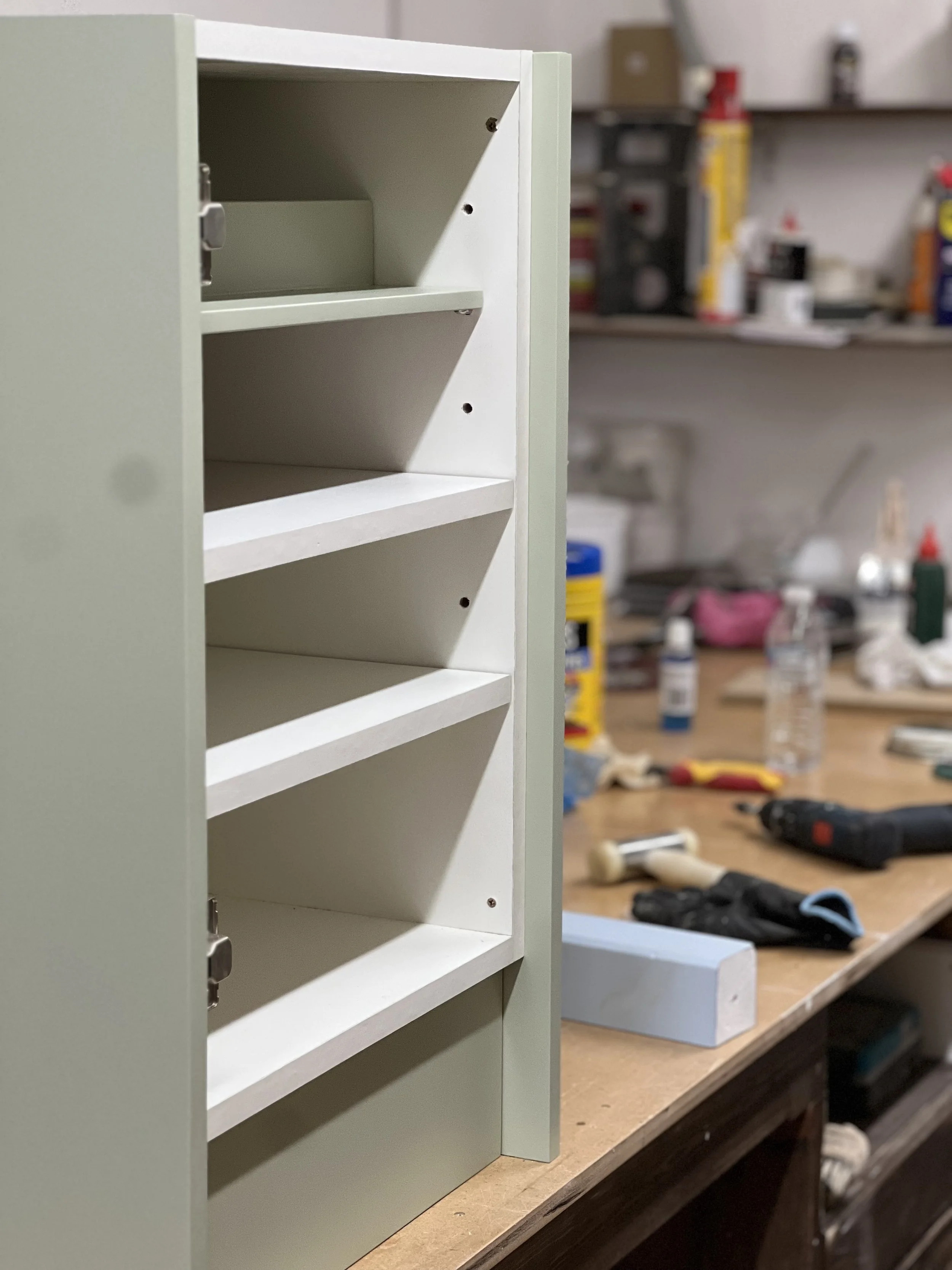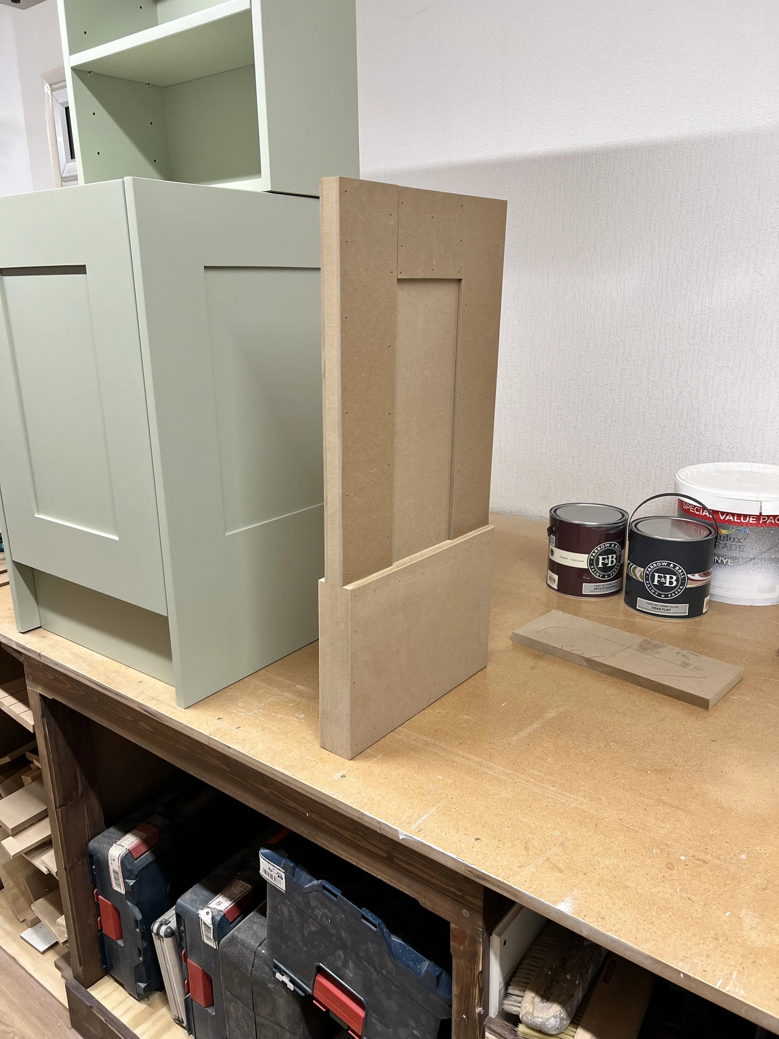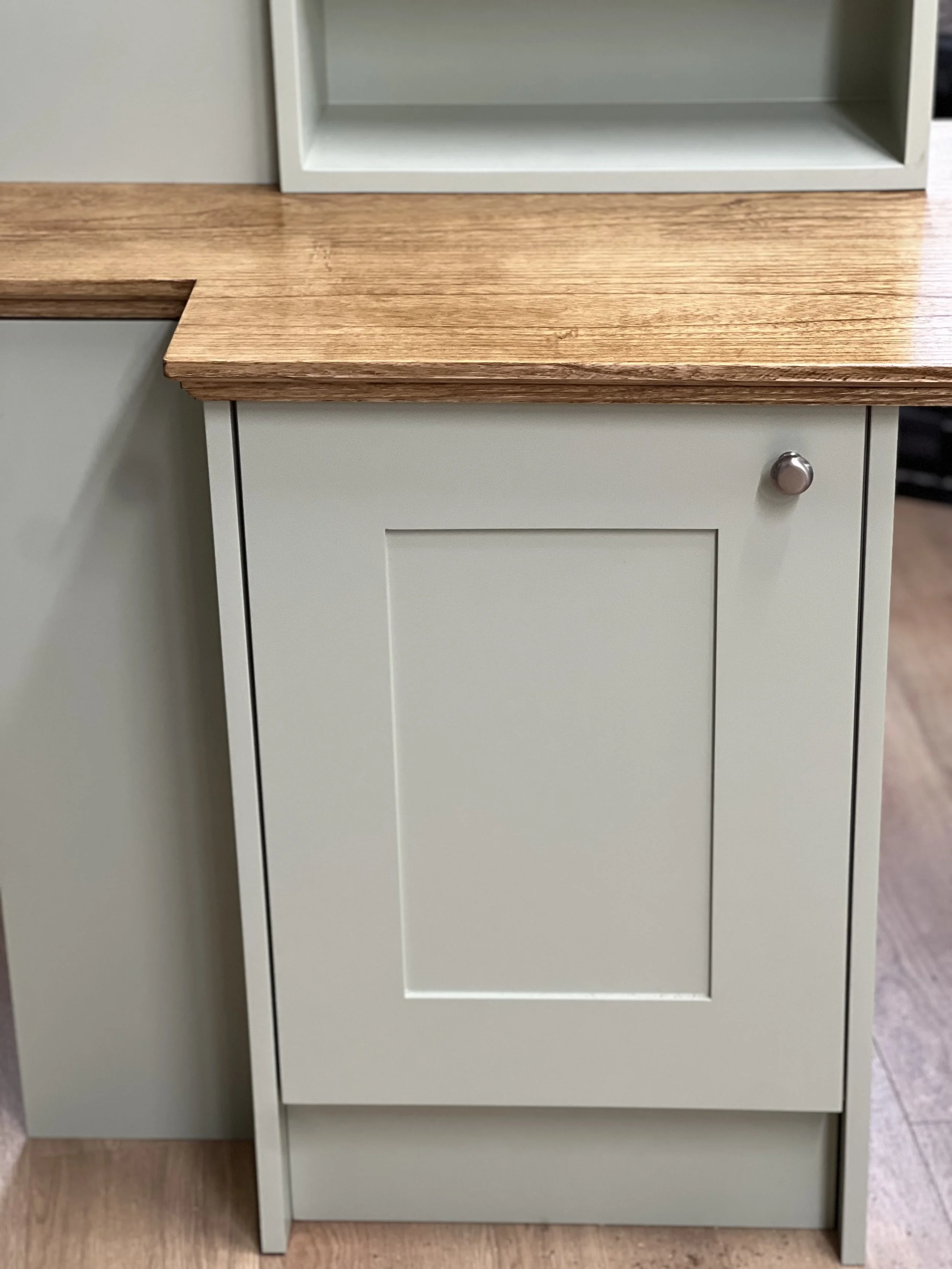 This complete home office was designed and built for a client in Twickenham, featuring a solid oak desktop finished to highlight the natural grain. The cabinetry is painted in Farrow & Ball’s Mizzle, creating a soft contrast with the oak. With integrated storage and hidden compartments for wires and internet services, the design combines elegance with practicality, delivering a clean and organised workspace.