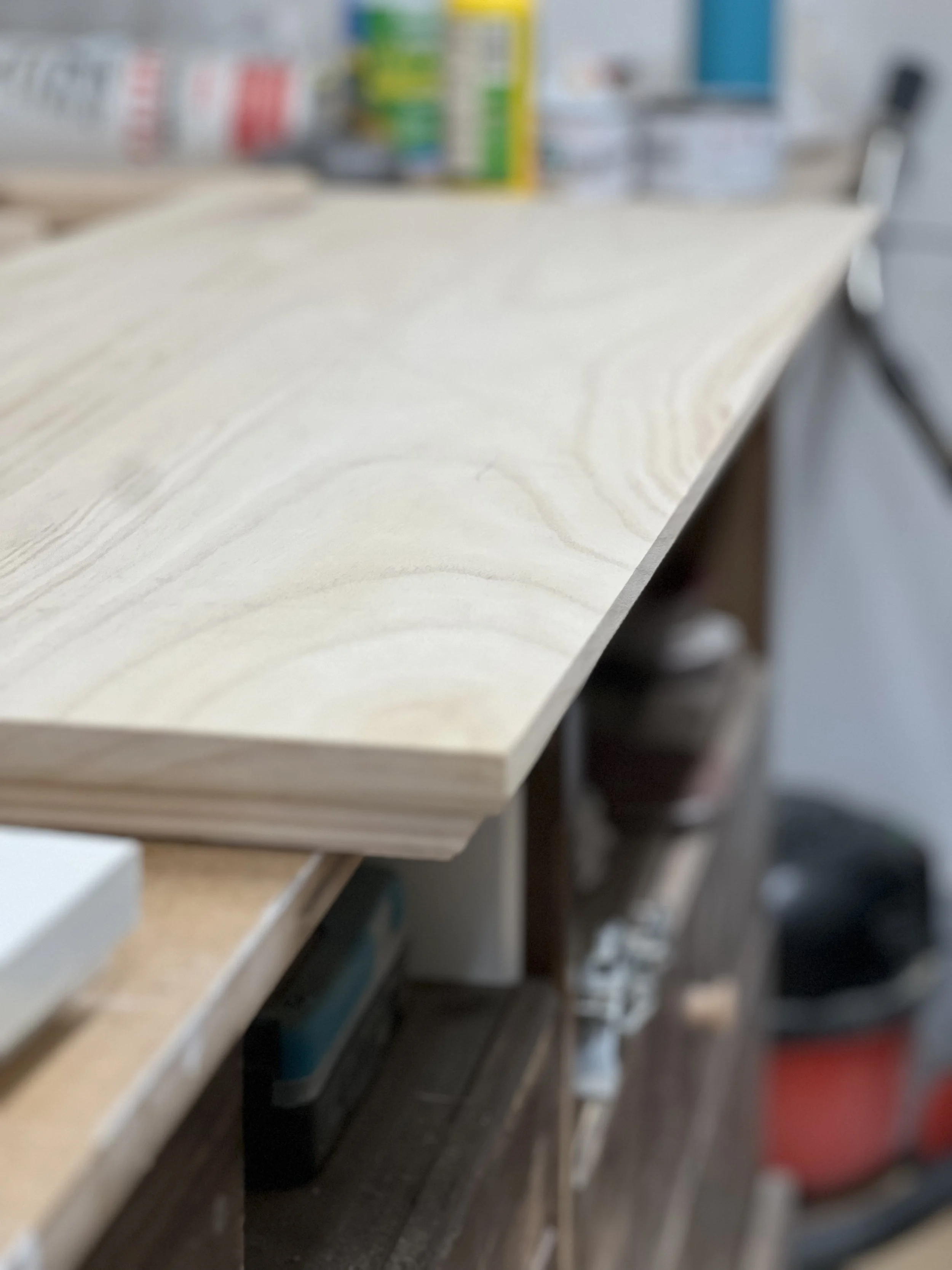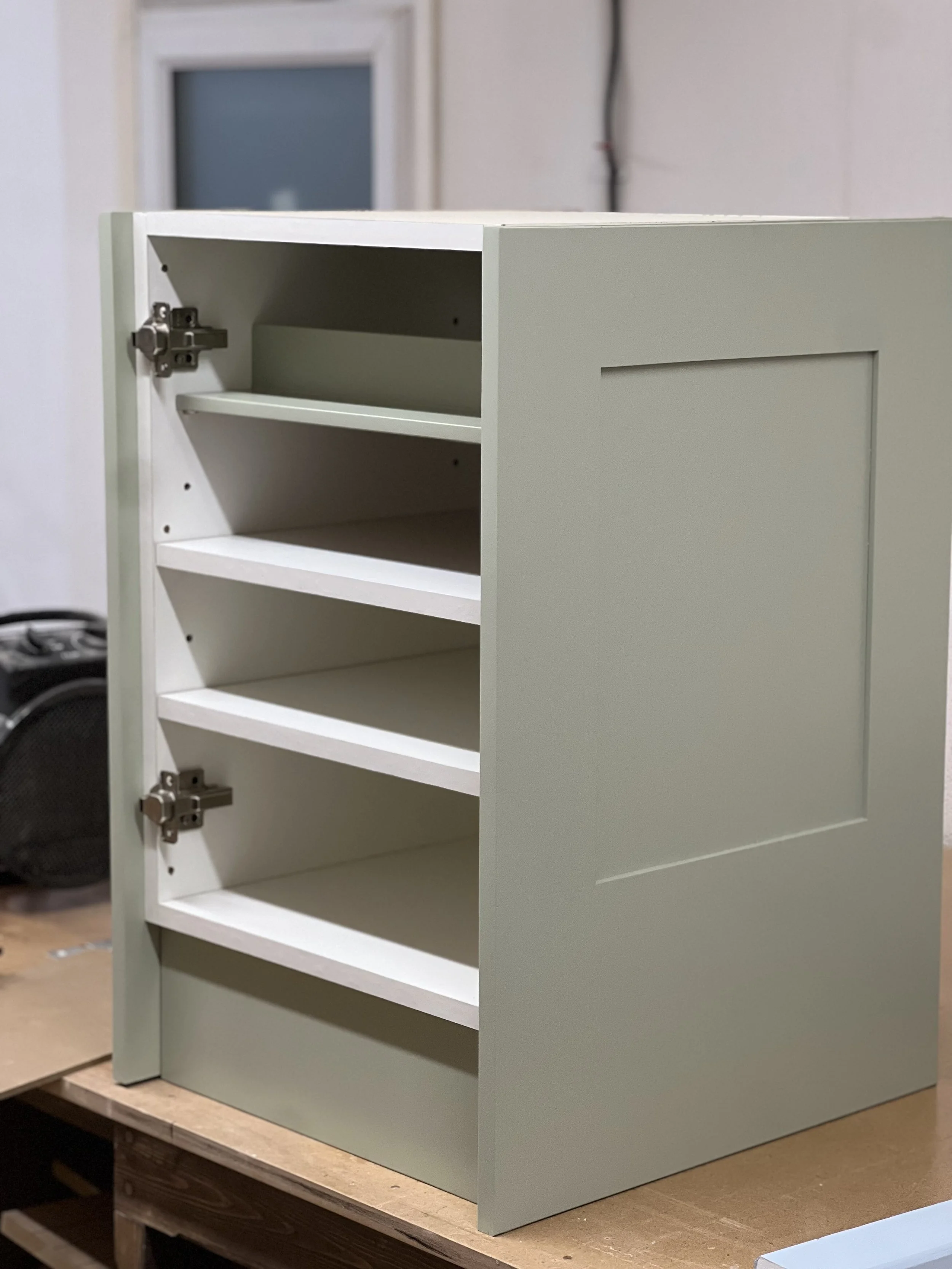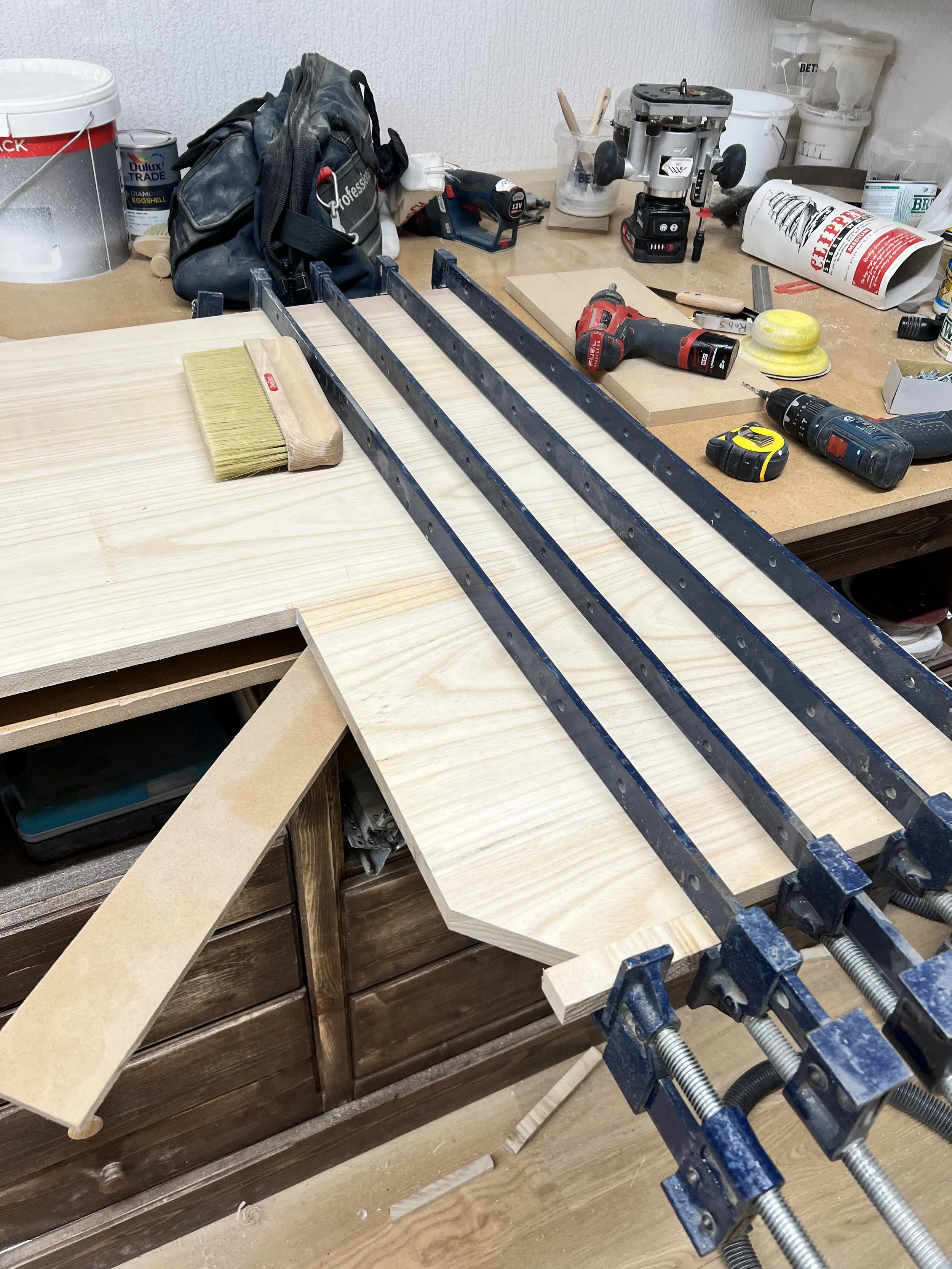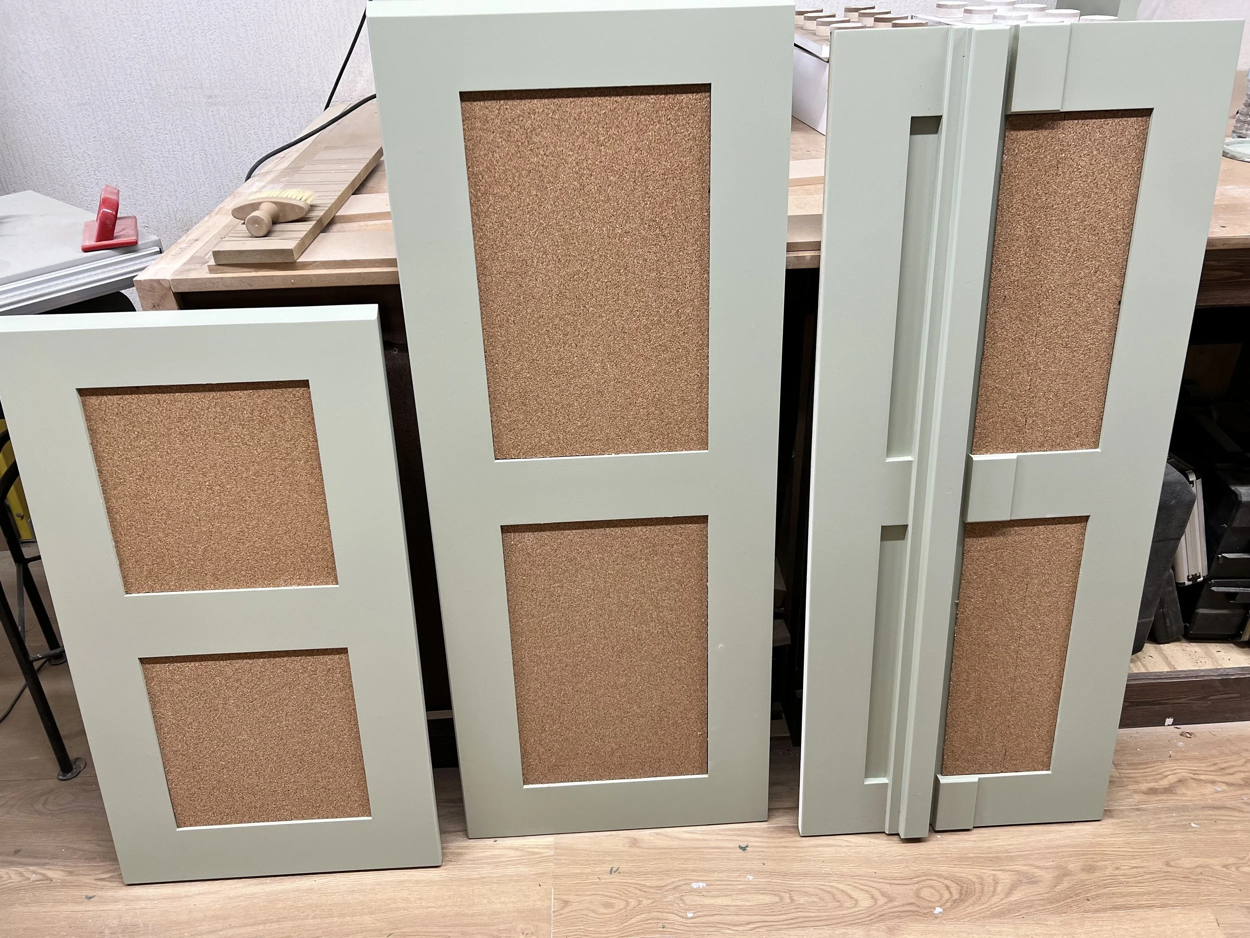 This complete home office was designed and built for a client in Twickenham, featuring a solid oak desktop finished to highlight the natural grain. The cabinetry is painted in Farrow & Ball’s Mizzle, creating a soft contrast with the oak. With integrated storage and hidden compartments for wires and internet services, the design combines elegance with practicality, delivering a clean and organised workspace.
