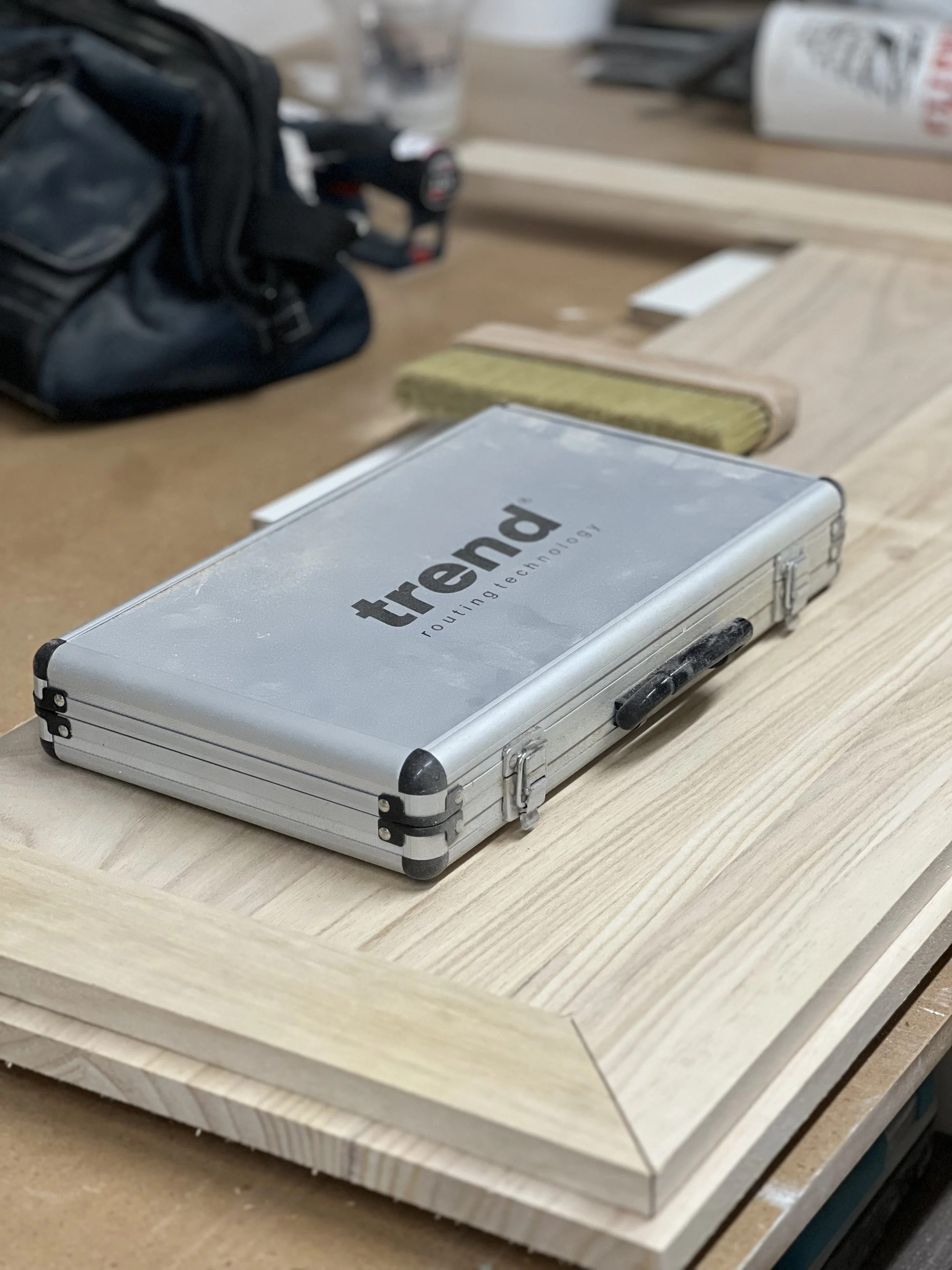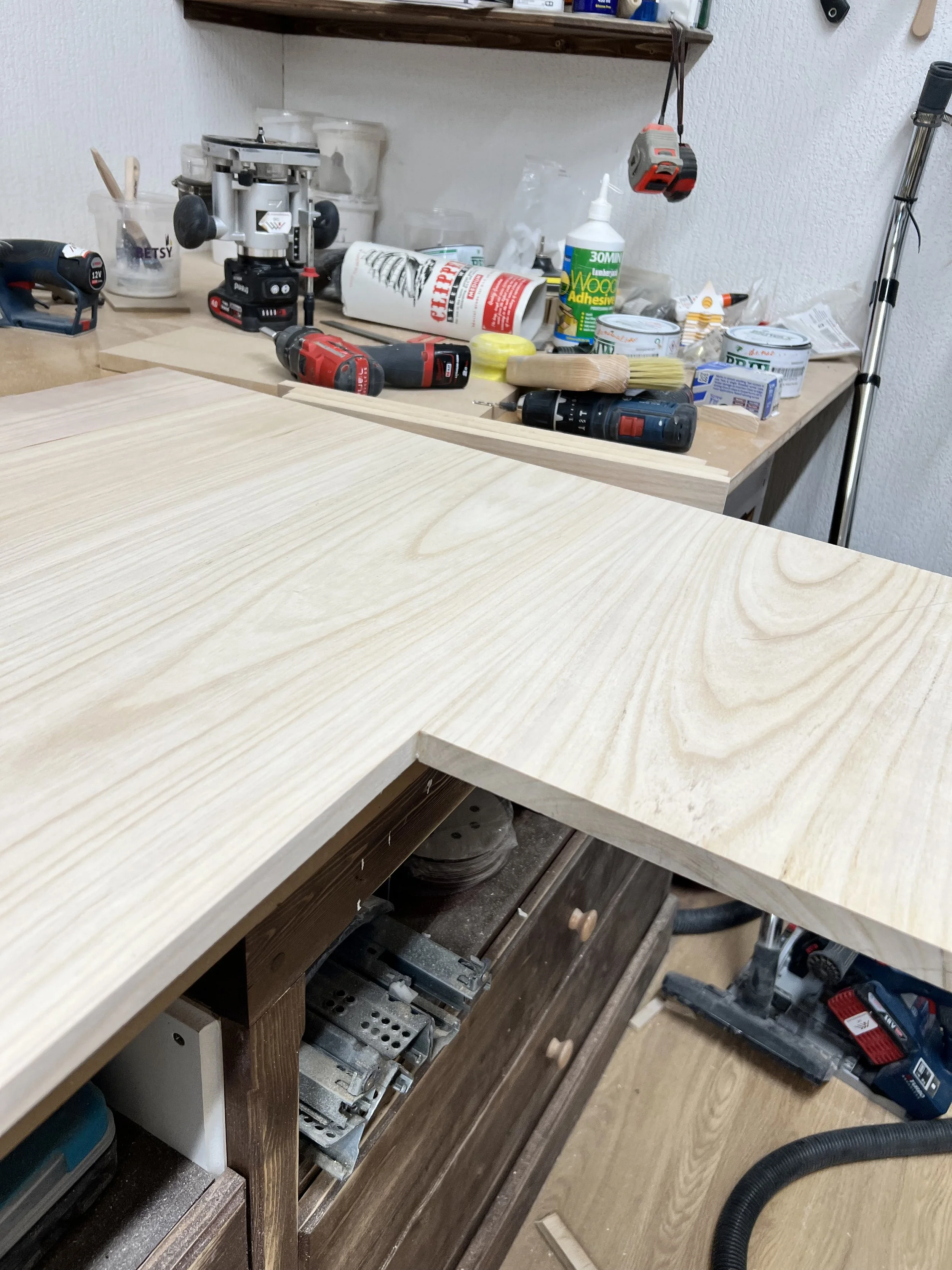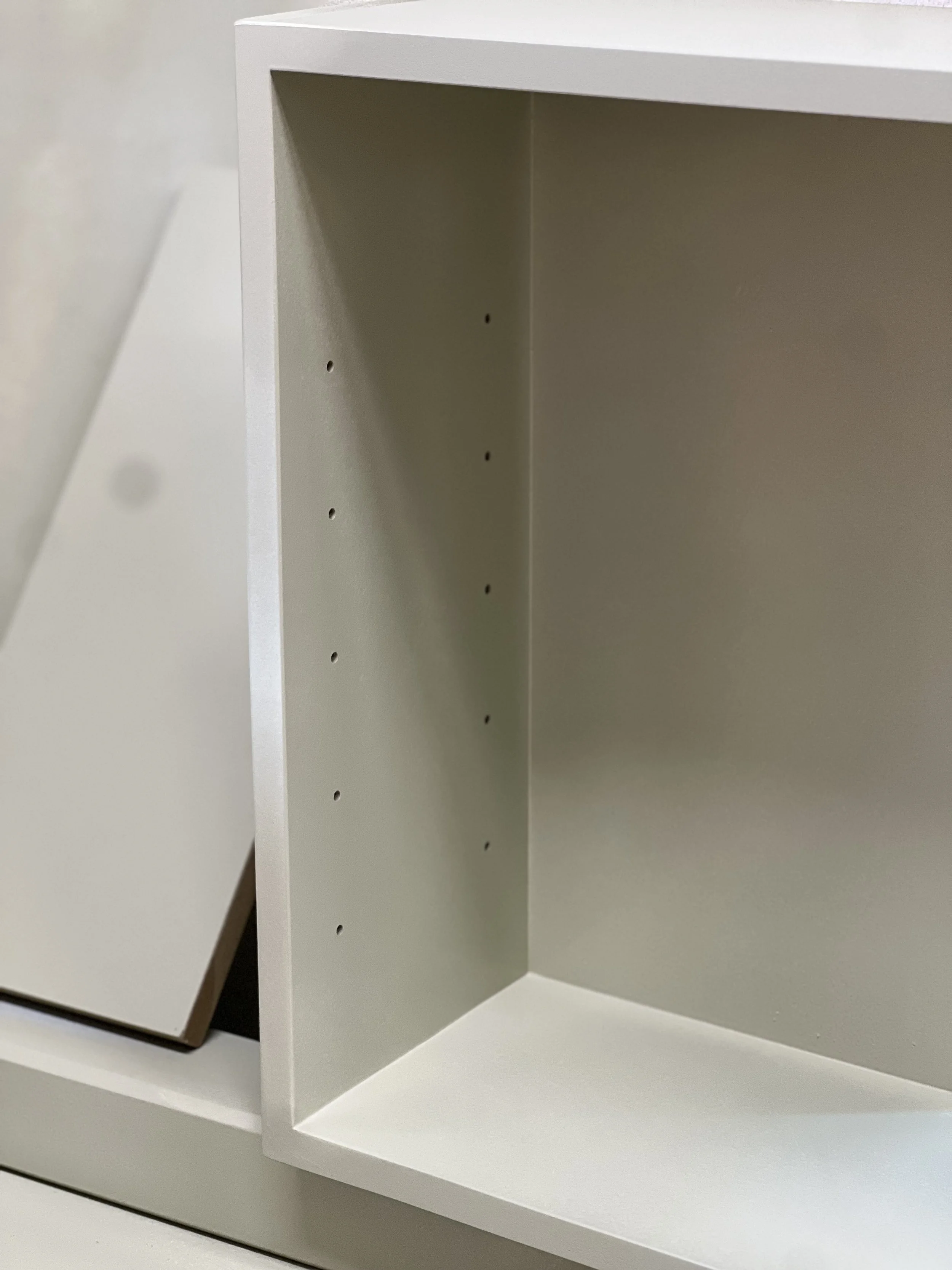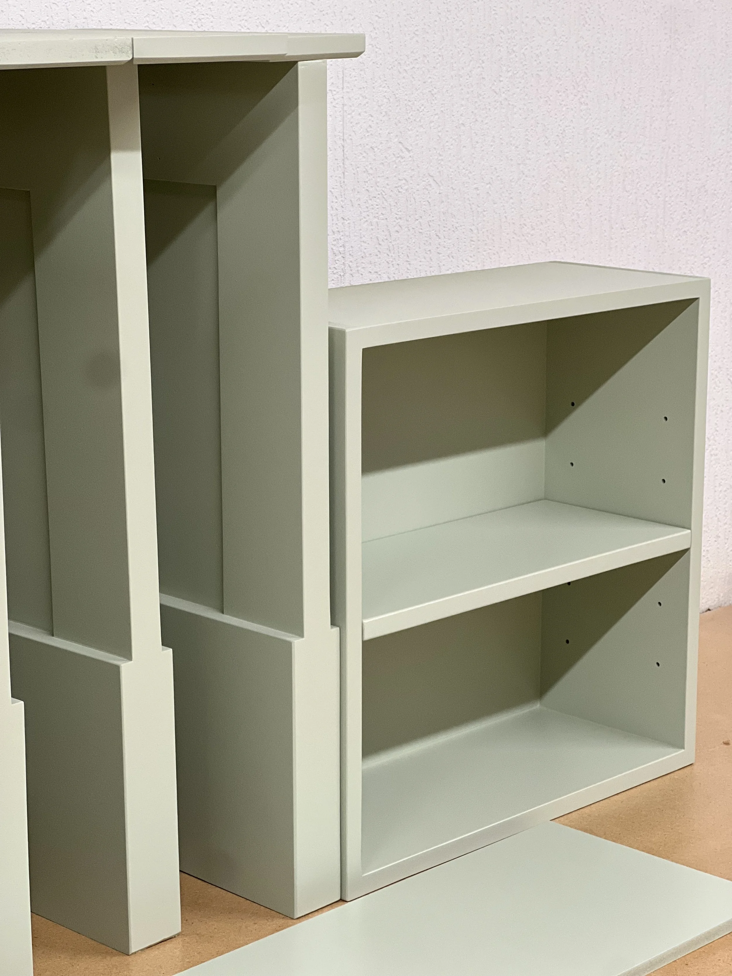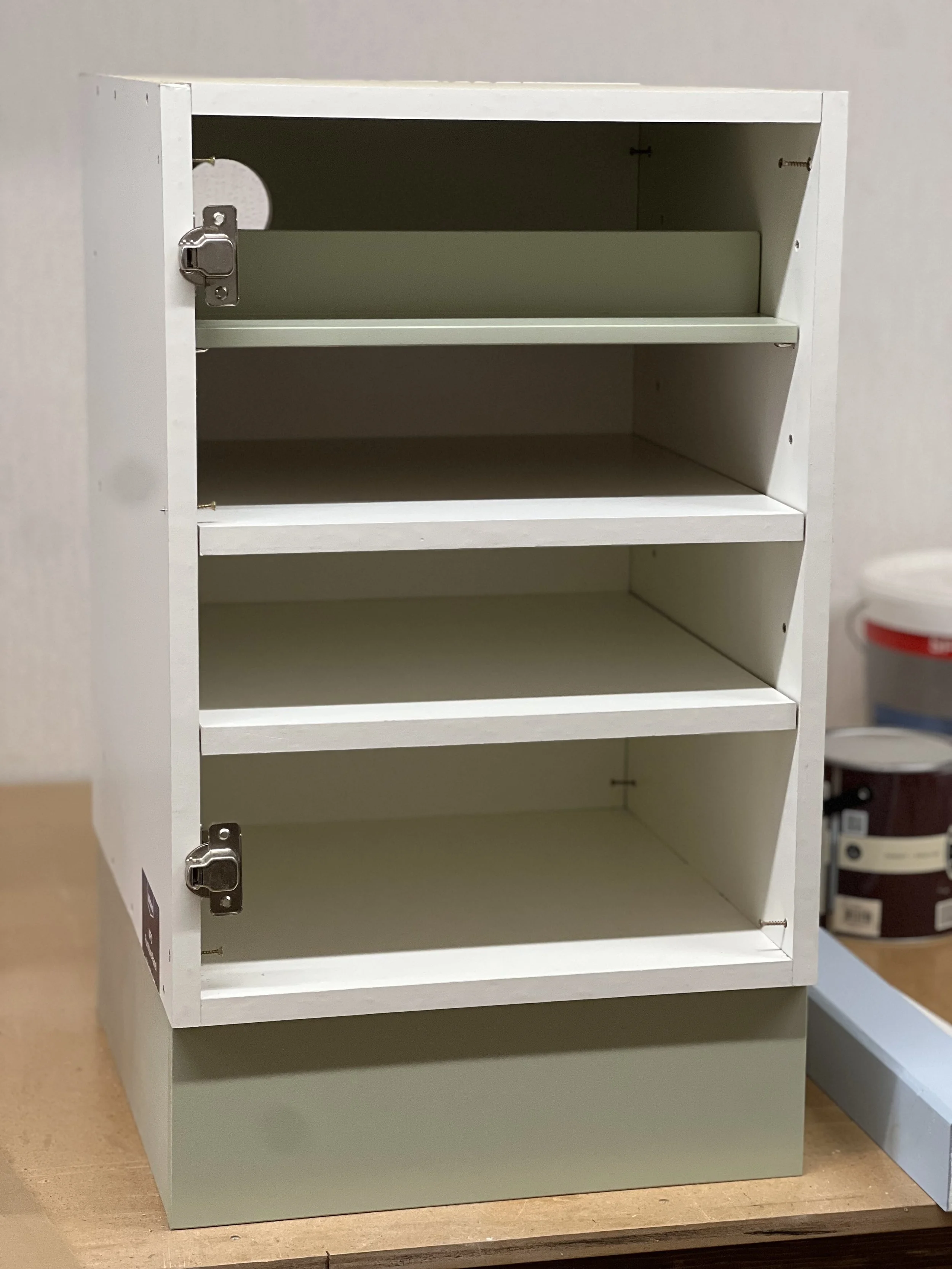 This complete home office was designed and built for a client in Twickenham, featuring a solid oak desktop finished to highlight the natural grain. The cabinetry is painted in Farrow & Ball’s Mizzle, creating a soft contrast with the oak. With integrated storage and hidden compartments for wires and internet services, the design combines elegance with practicality, delivering a clean and organised workspace.