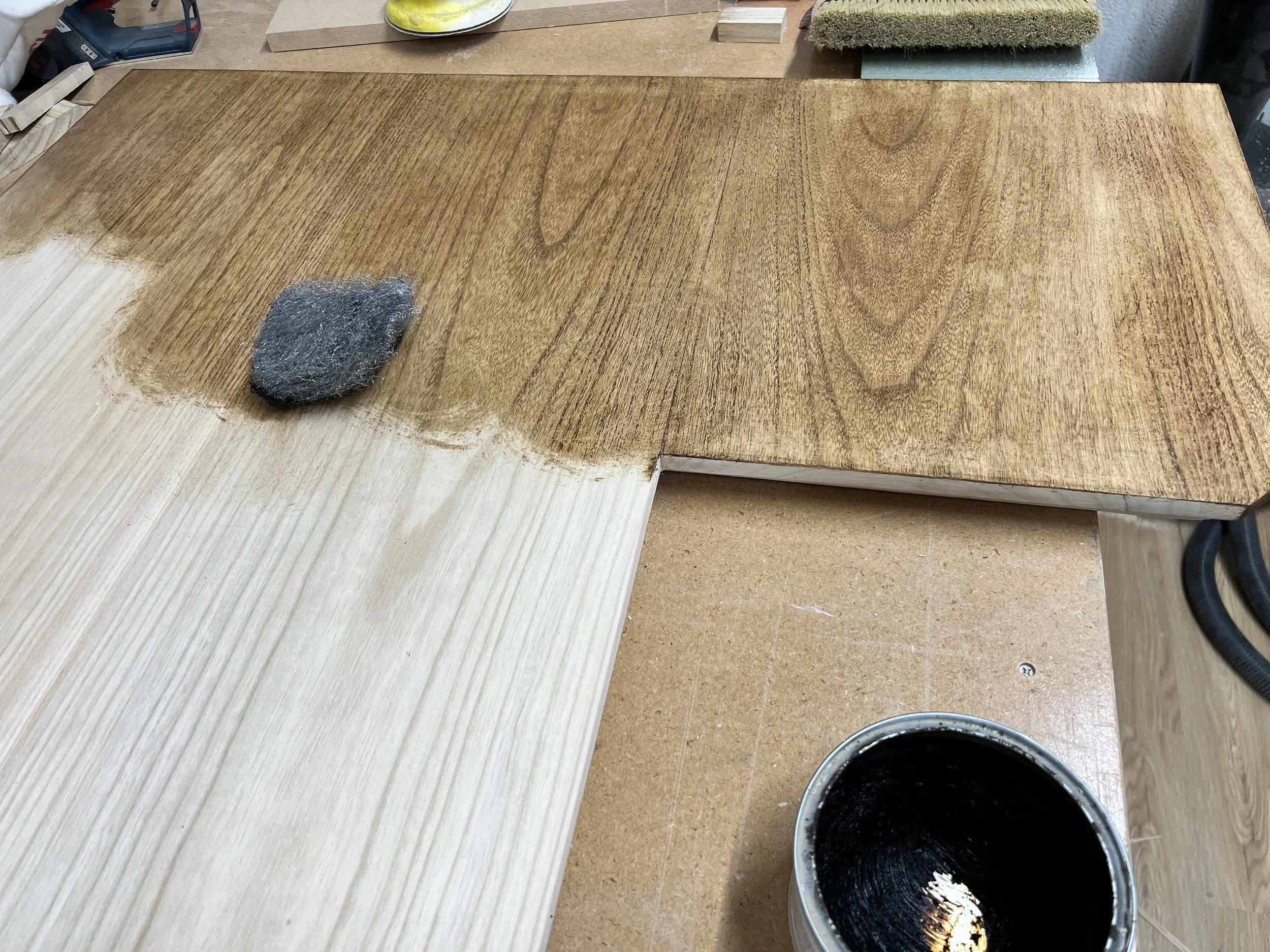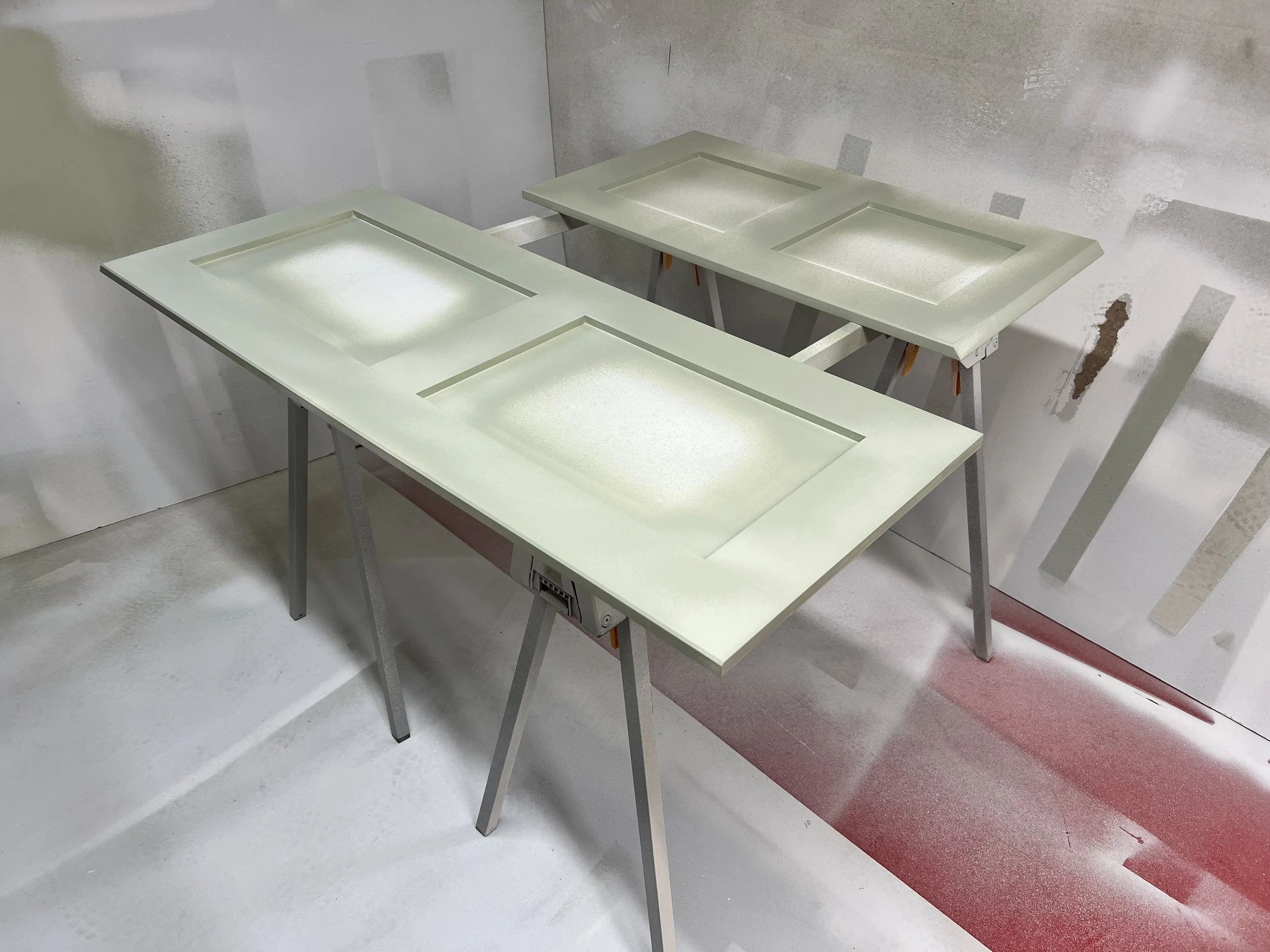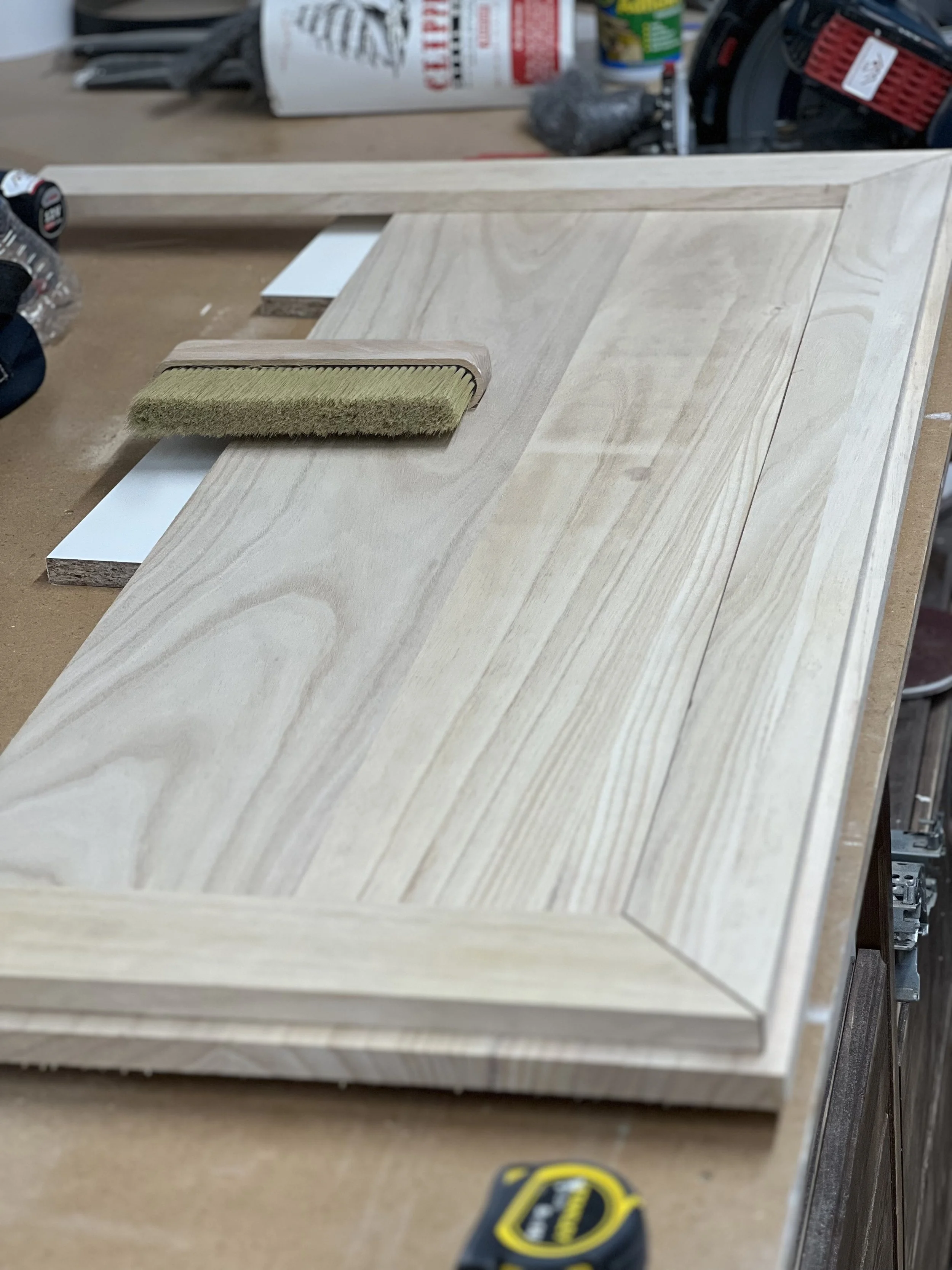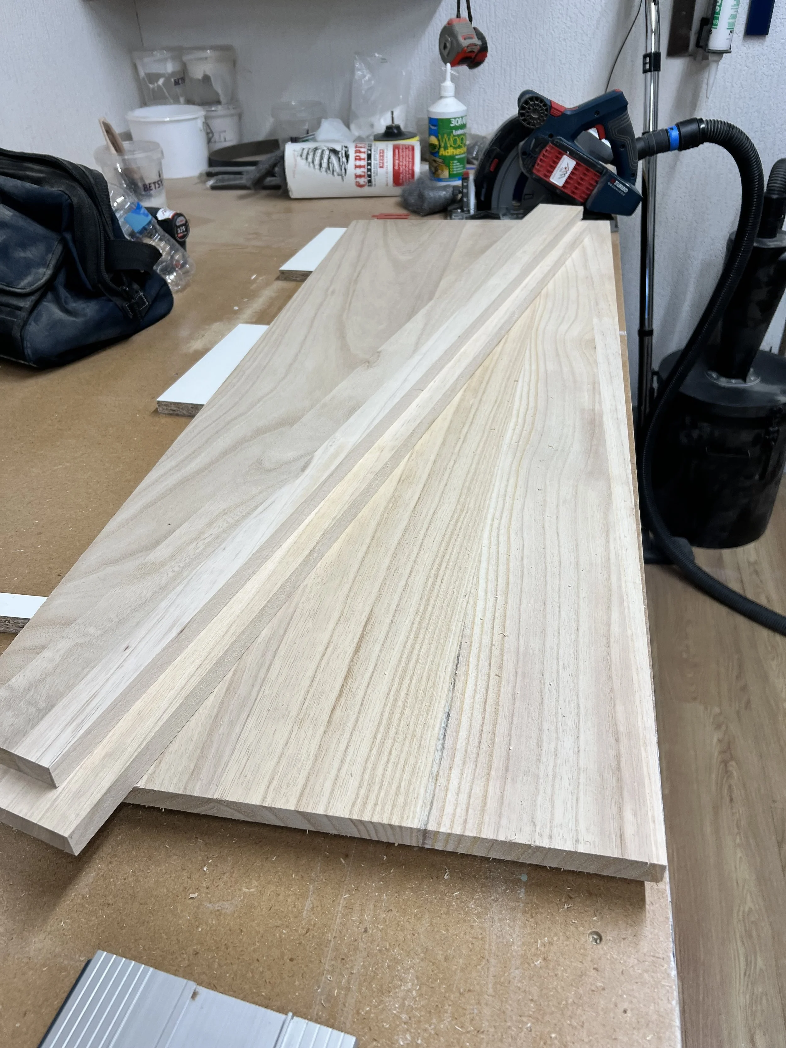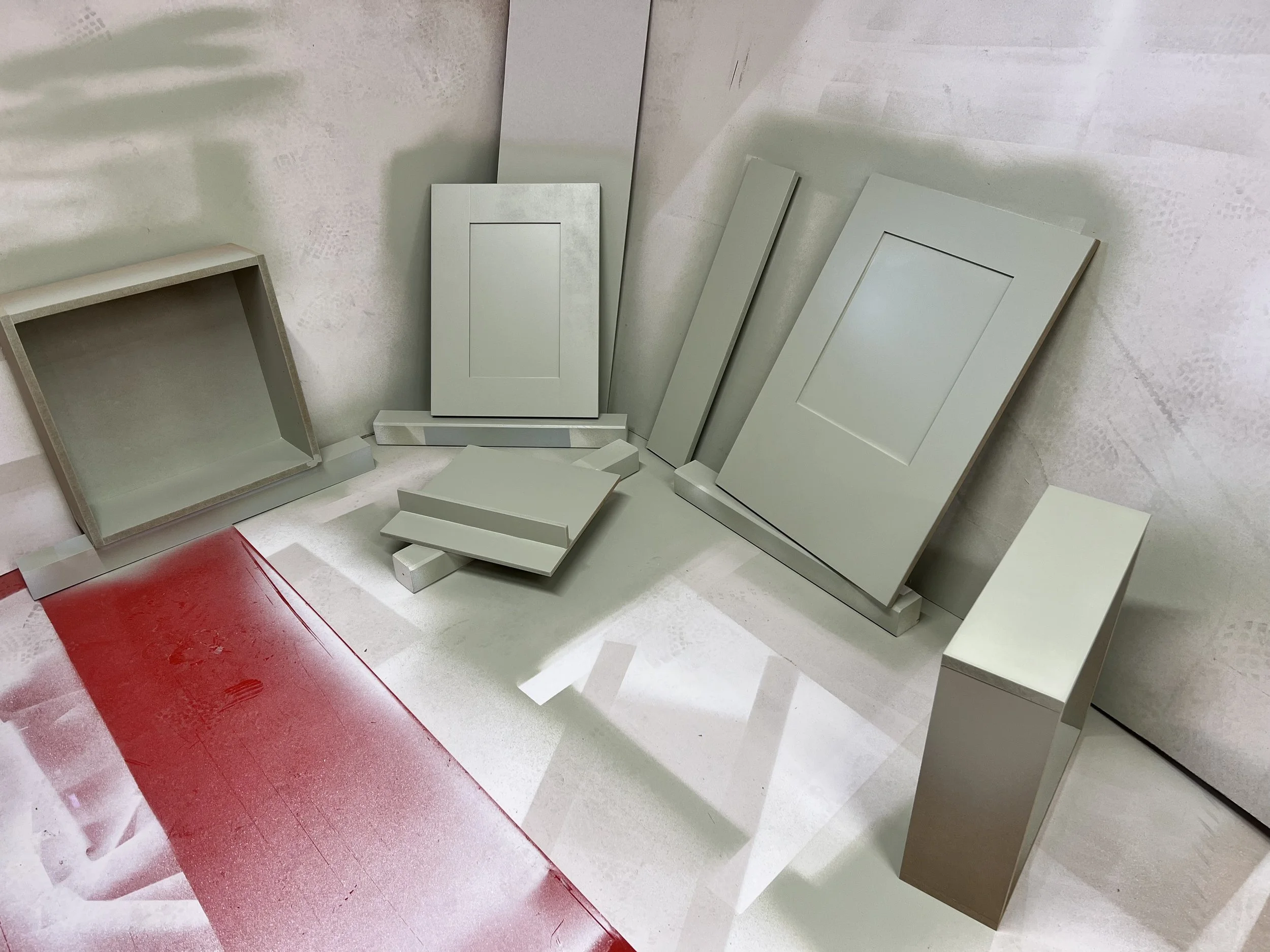 This complete home office was designed and built for a client in Twickenham, featuring a solid oak desktop finished to highlight the natural grain. The cabinetry is painted in Farrow & Ball’s Mizzle, creating a soft contrast with the oak. With integrated storage and hidden compartments for wires and internet services, the design combines elegance with practicality, delivering a clean and organised workspace.