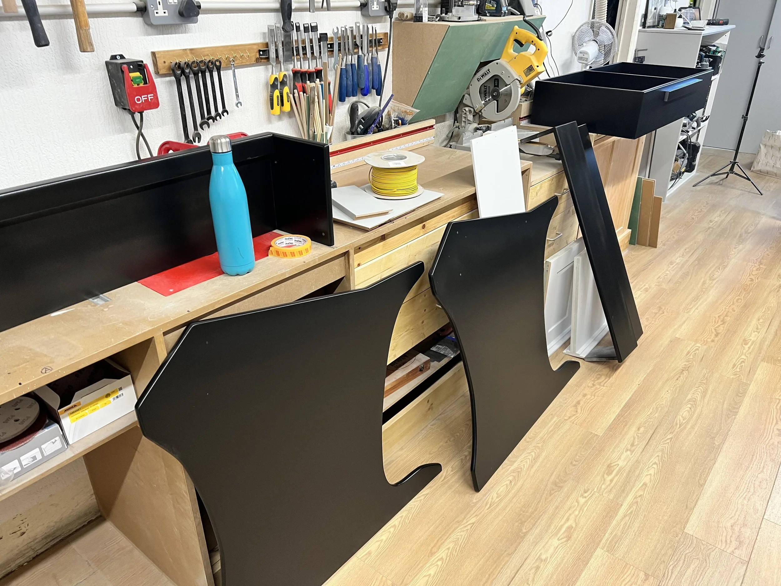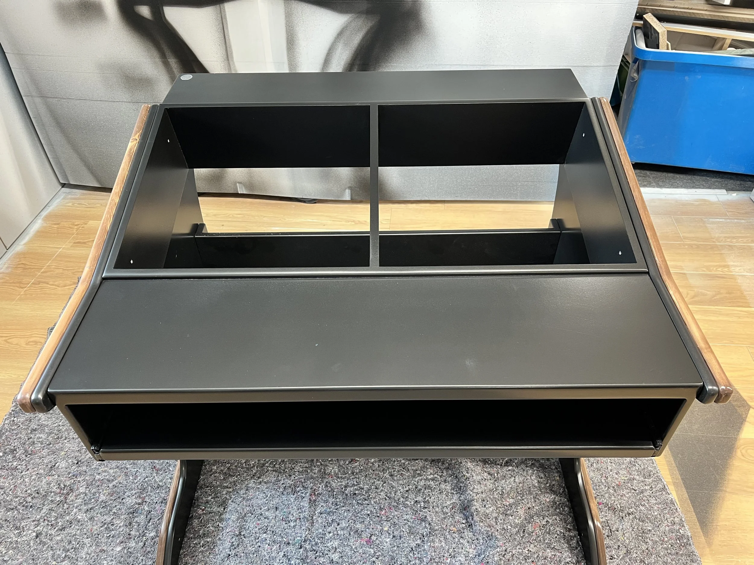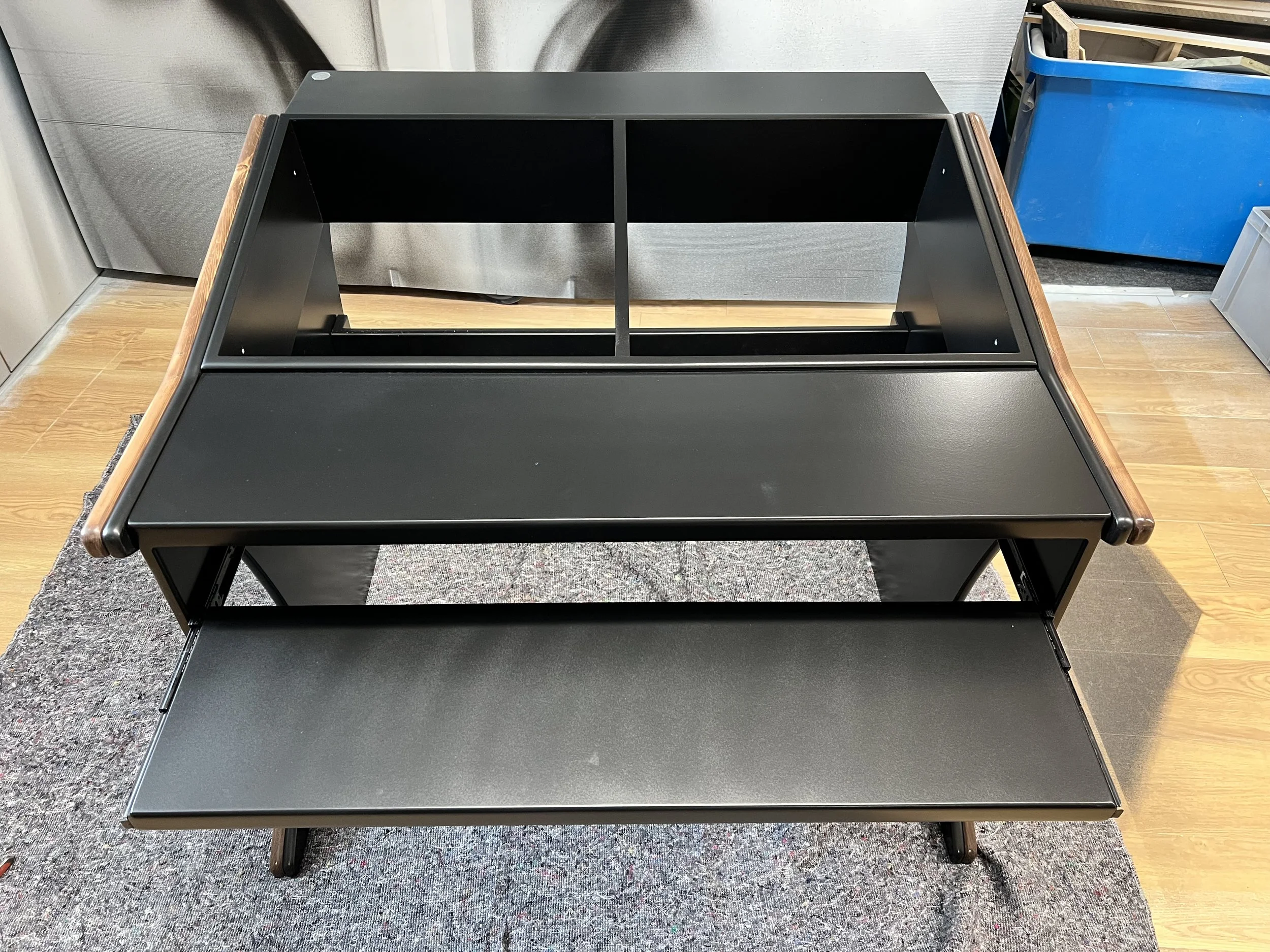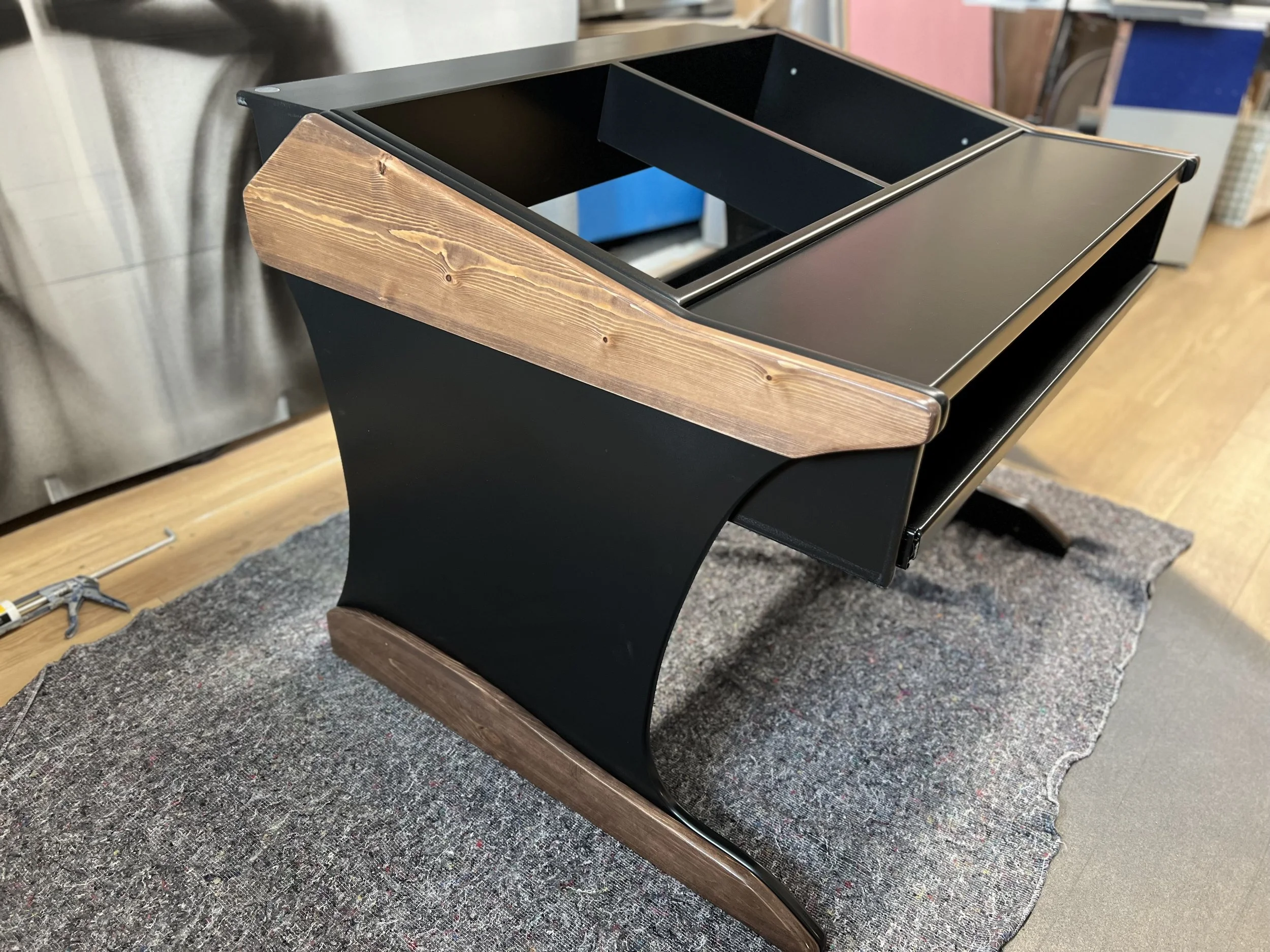 This custom-built mixing desk was designed to meet a client’s exact studio requirements. Constructed with a sleek black finish and contrasted with stained timber details, it features integrated compartments and a pull-out keyboard shelf. Built for both style and practicality, the desk creates a professional workspace tailored for music production.