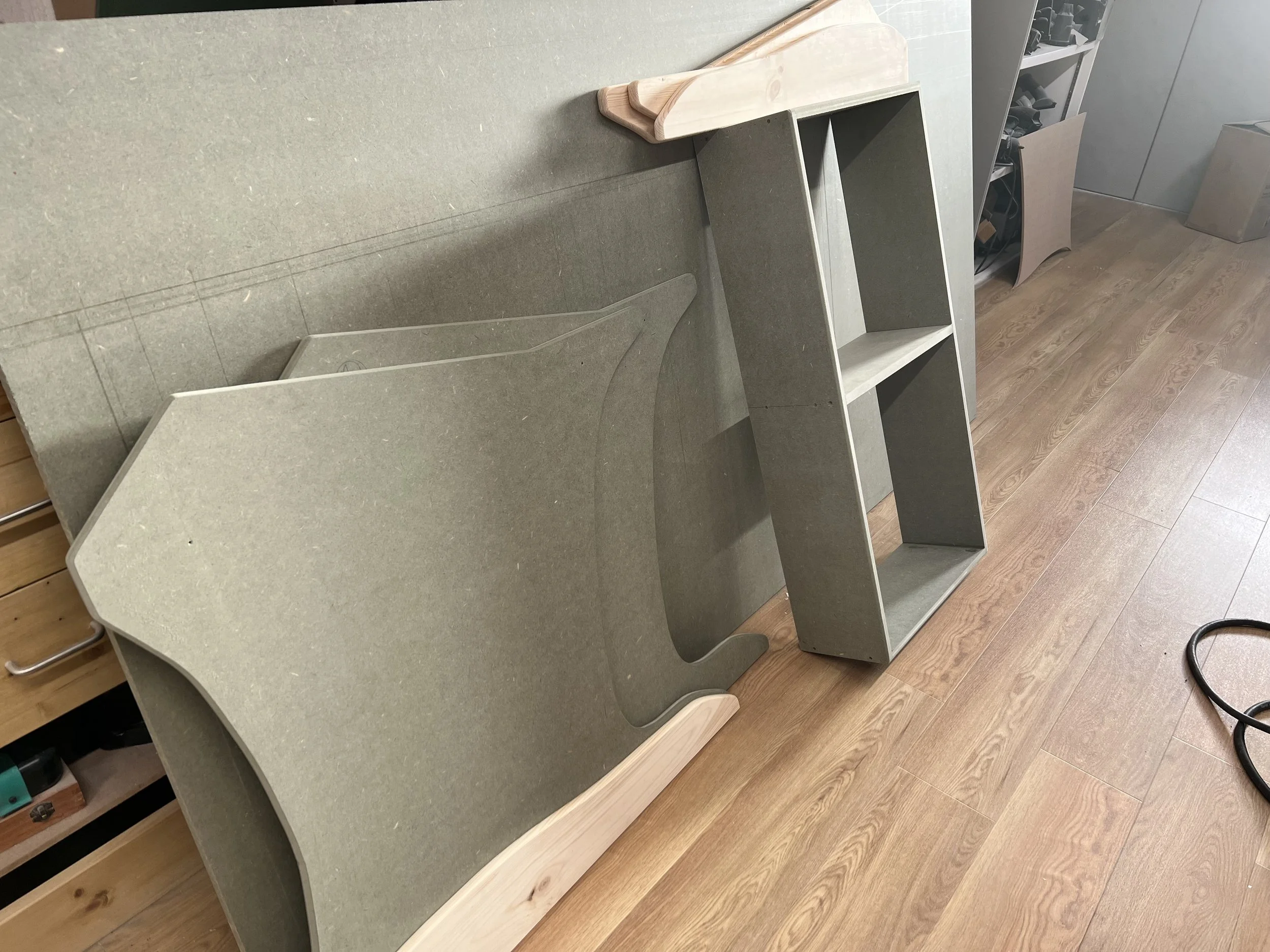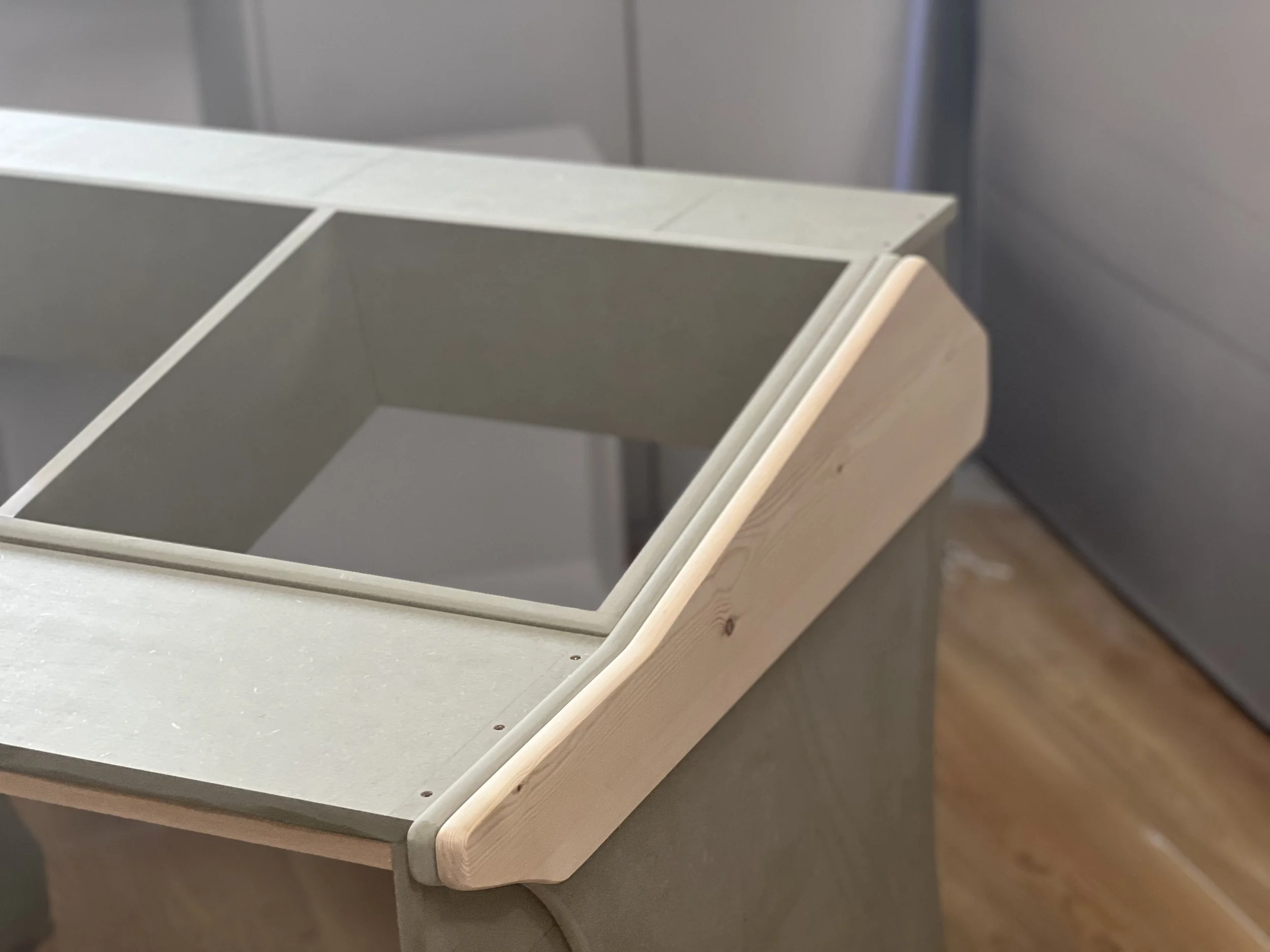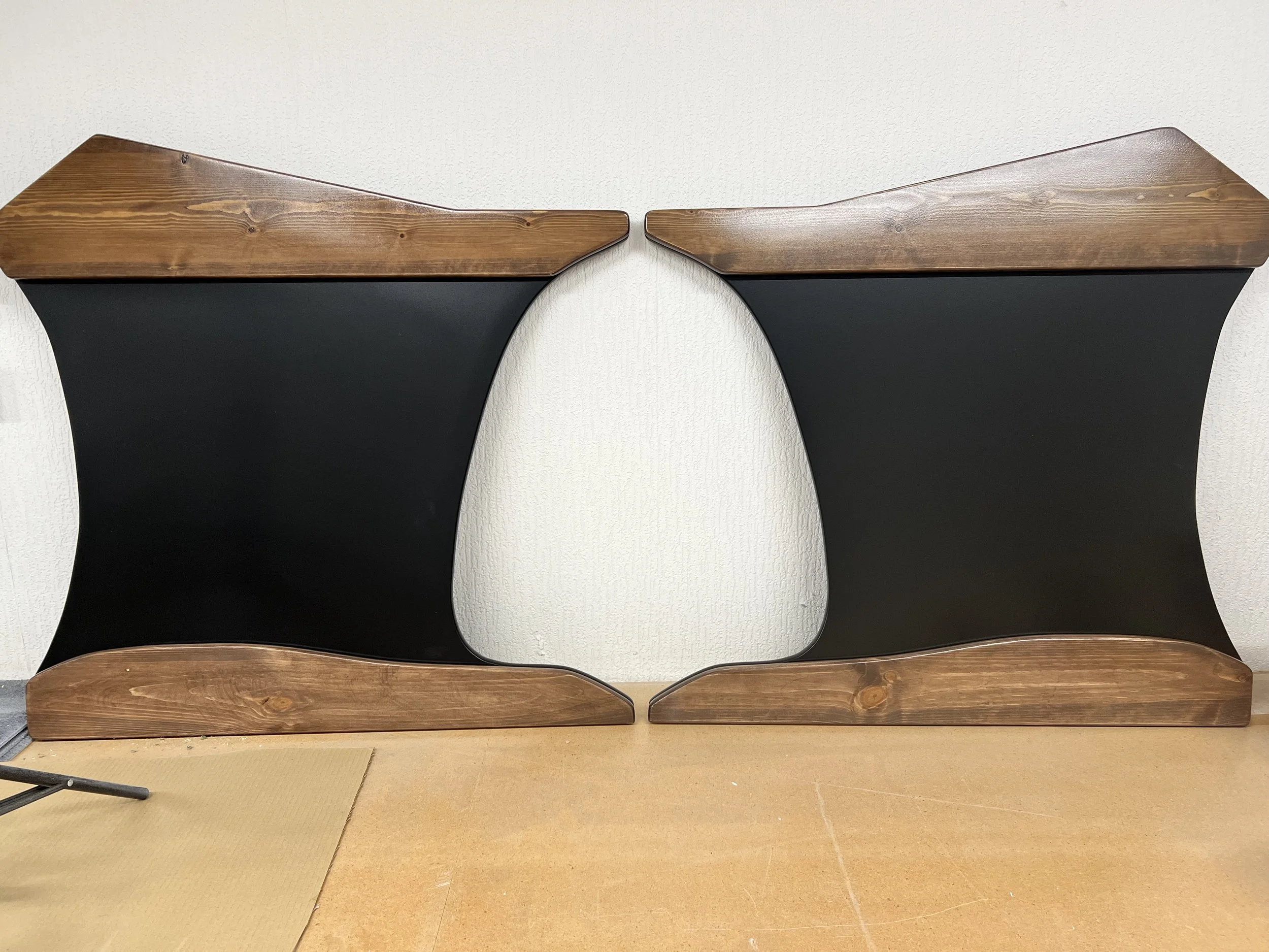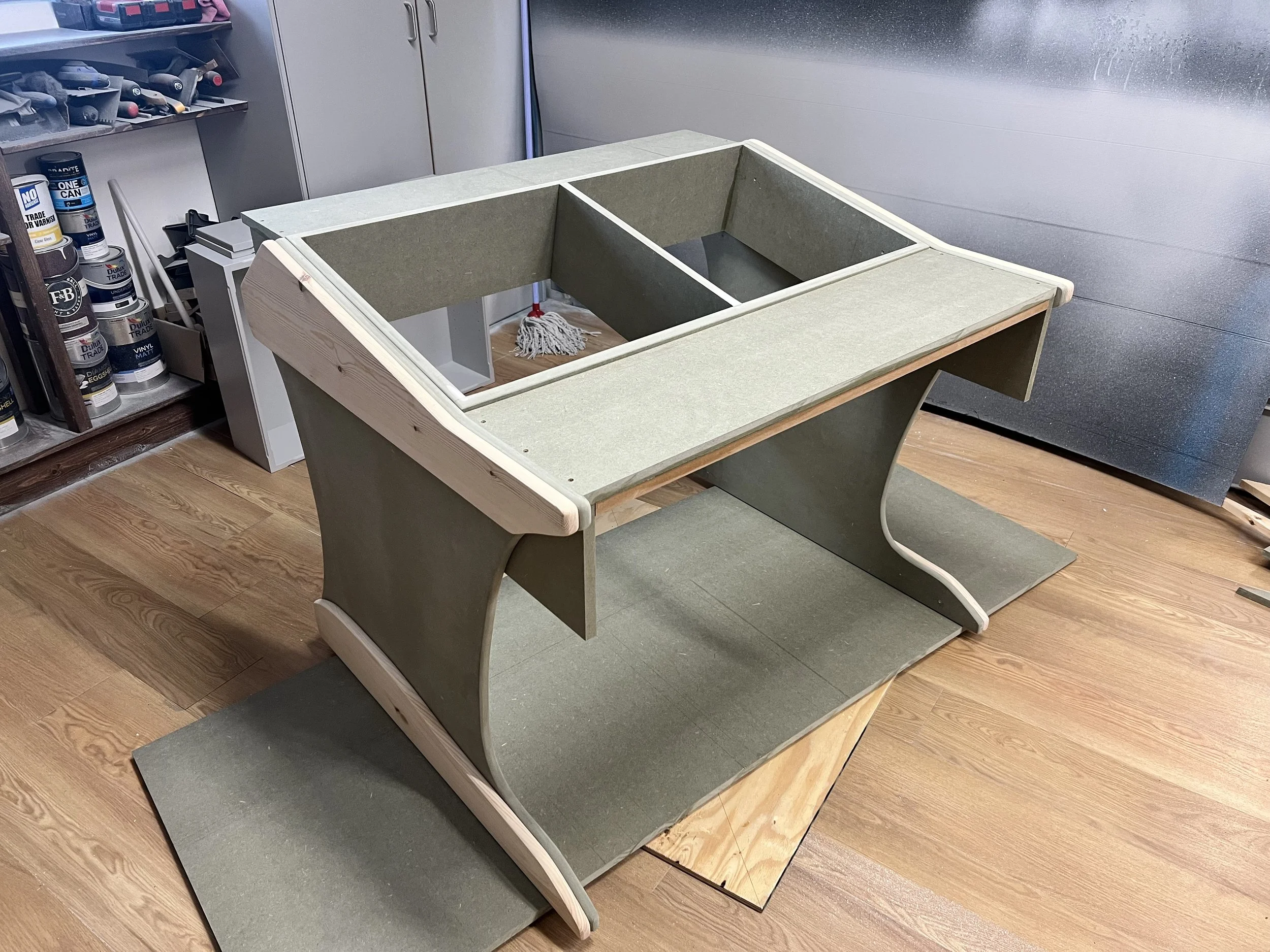 This custom-built mixing desk was designed to meet a client’s exact studio requirements. Constructed with a sleek black finish and contrasted with stained timber details, it features integrated compartments and a pull-out keyboard shelf. Built for both style and practicality, the desk creates a professional workspace tailored for music production.