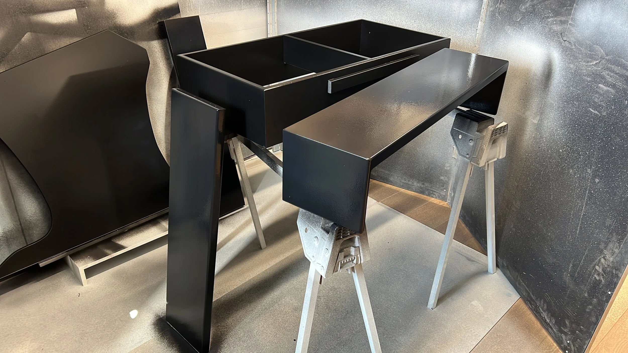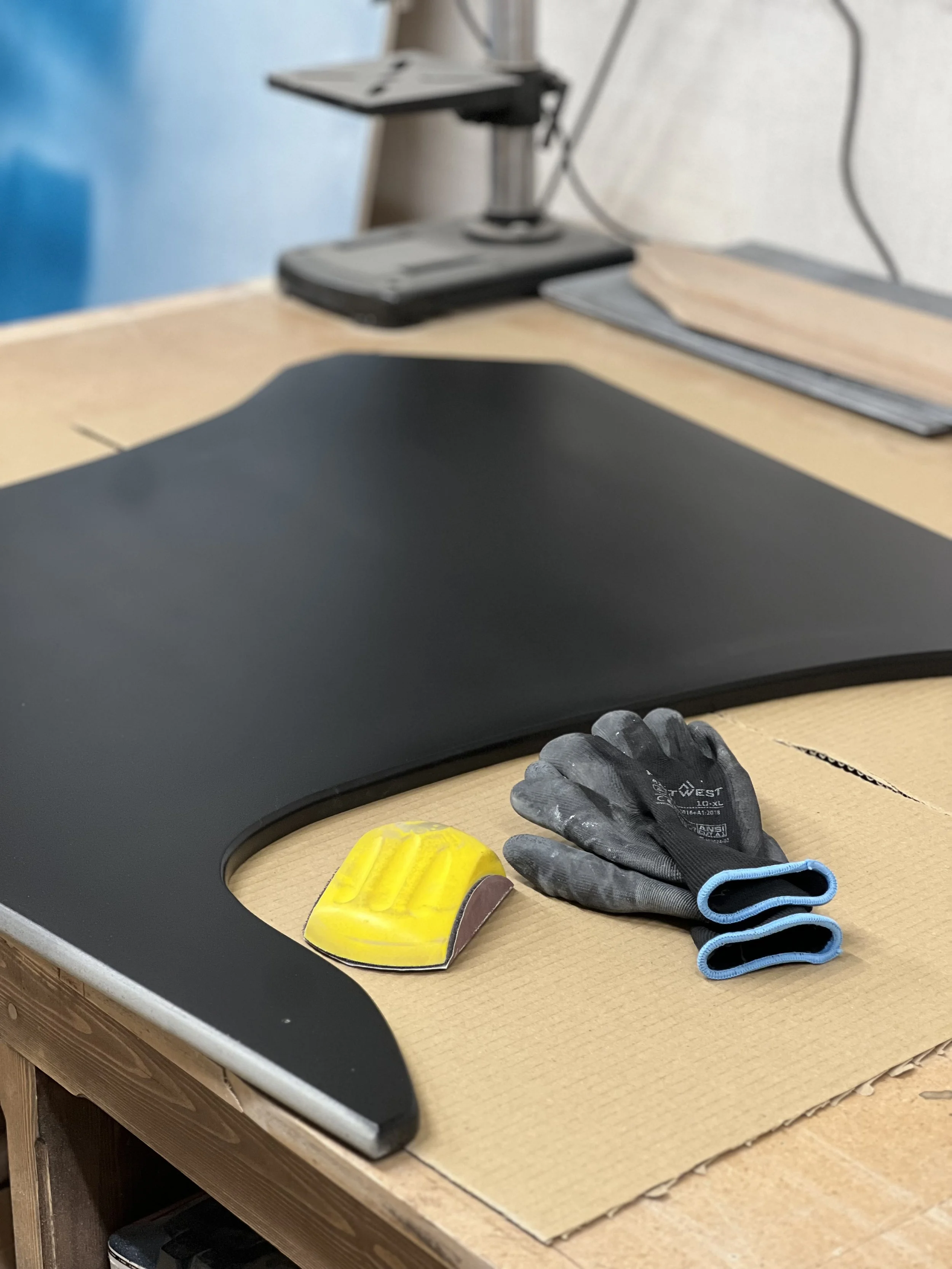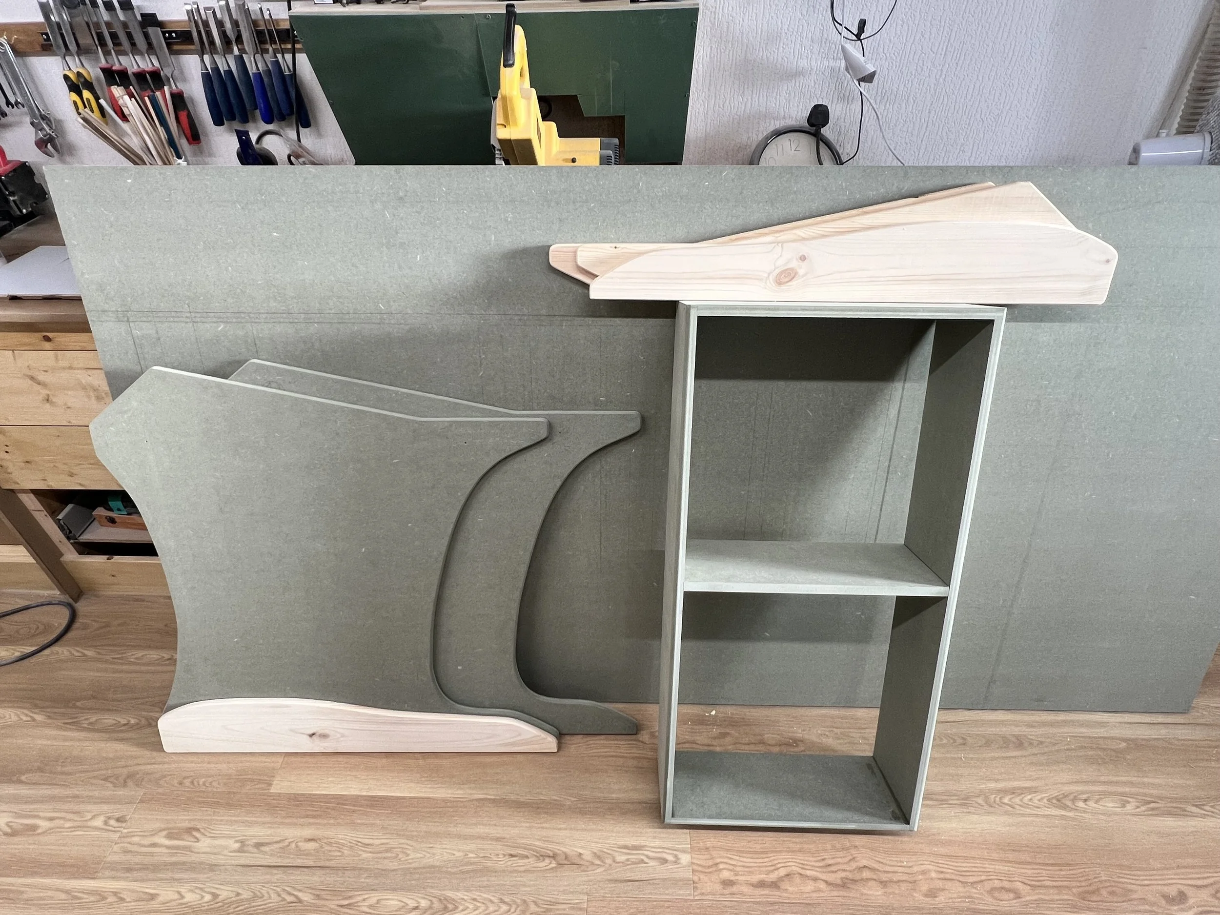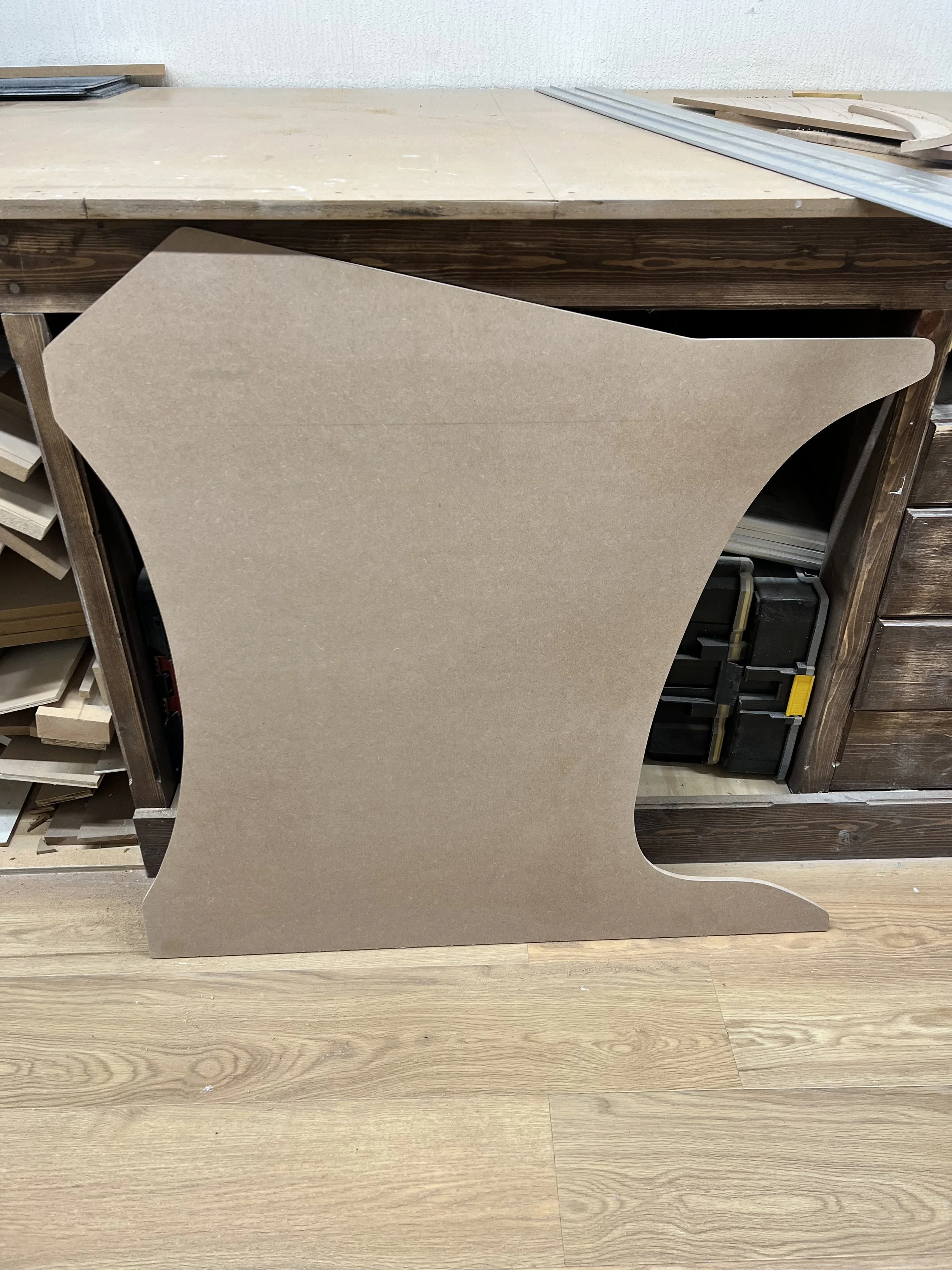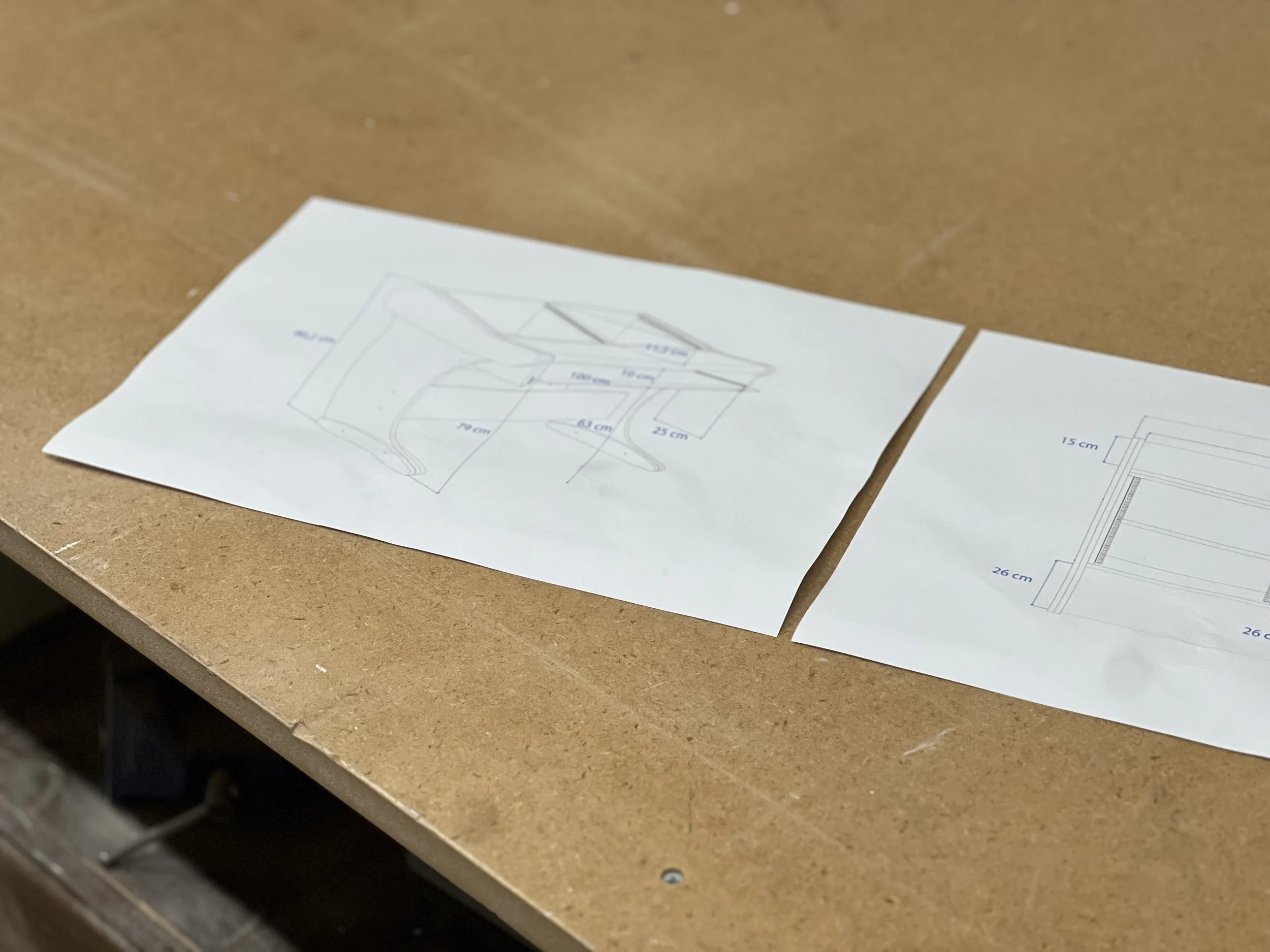 This custom-built mixing desk was designed to meet a client’s exact studio requirements. Constructed with a sleek black finish and contrasted with stained timber details, it features integrated compartments and a pull-out keyboard shelf. Built for both style and practicality, the desk creates a professional workspace tailored for music production.